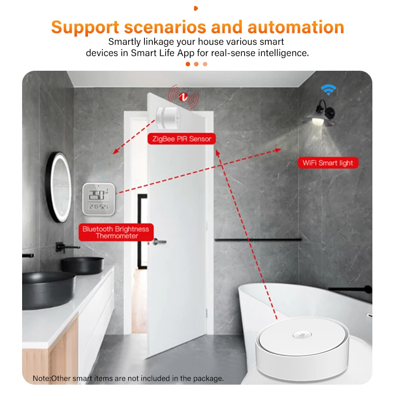 3. Пульт дистанционного управления: удаленно Управляйте устройствами, которые подключены к шлюзу через мобильный телефон через приложение Tuya Smart независимо от того, где вы находитесь, нет необходимости отдельно управлять устройствами Bluetooth и ZigBee в двух разных интерфейсах, просто Управляйте ими в одном многомодовом шлюзе с надежной локальной связью и поддержкой группового управления.