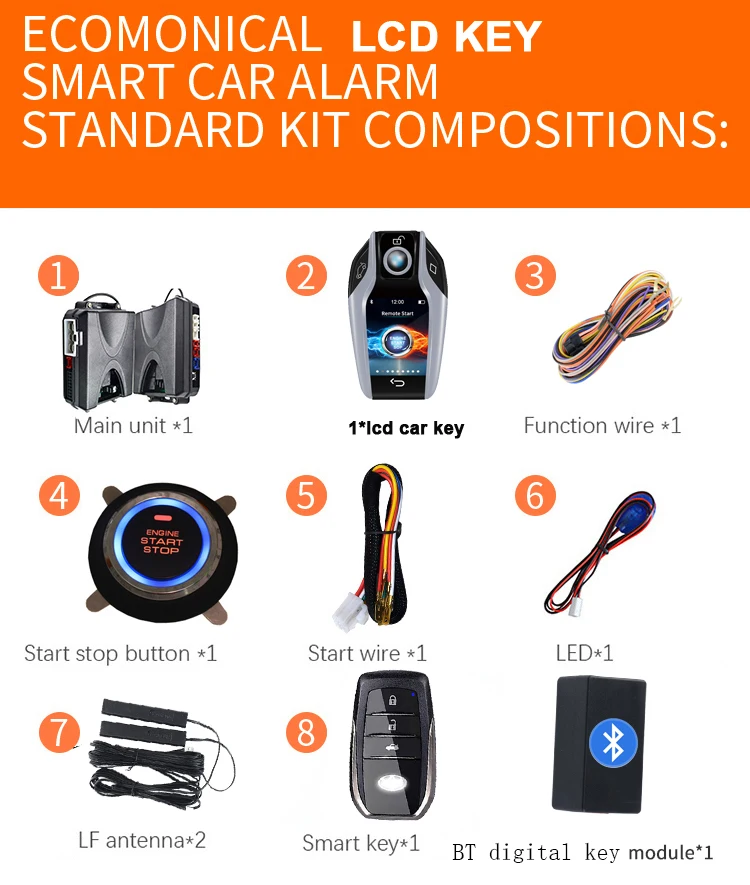 1 шт. основной блок, 1 шт. пусковые кабели, 1 шт. основные кабели, 1 шт. автомобильный жидкий ключ, 1 шт. умный ключ, 2 шт. PKE антенны, 1 шт. кнопка запуска стоп, 1 шт. Bt модуль (подарок!),1 шт. светодиодная лампа, 1 шт. цветная коробка.