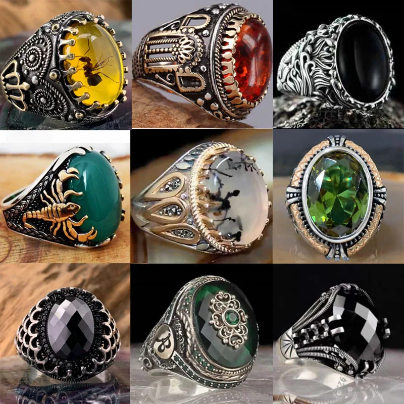 2022 модное мусульманское ювелирное Ретро турецкое мужское кольцо ручной работы винтажный узор красные зеленые янтарные кольца для мужчин женщин панк кольцо из циркона