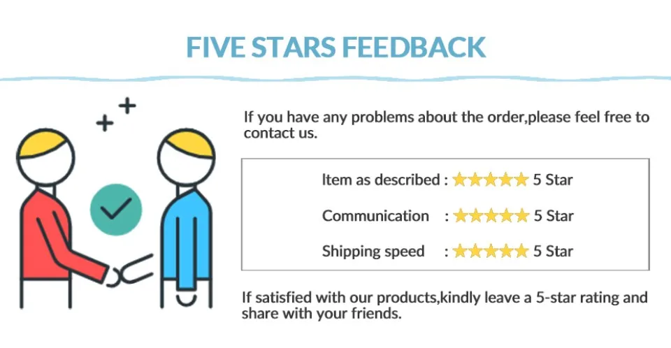 Пять звезд Отзывы: Ваше удовлетворение-наша главная мотивация!1. Если вы удовлетворены товарами и нашим обслуживанием, пожалуйста, уделите минуту, чтобы оставить нам положительный отзыв с 5 звездами.2. Пожалуйста, не стесняйтесь связаться с нами, чтобы получить лучшее решение, прежде чем оставить нейтральный или отрицательный отзывы. Мы предоставим Вам лучший сервис.