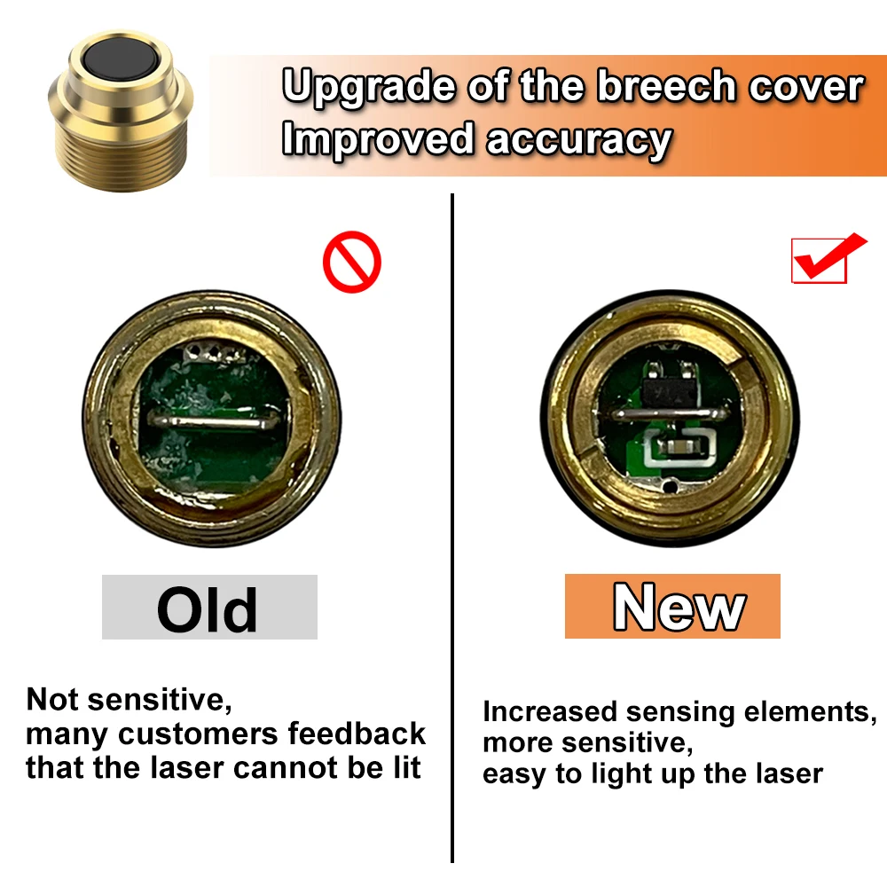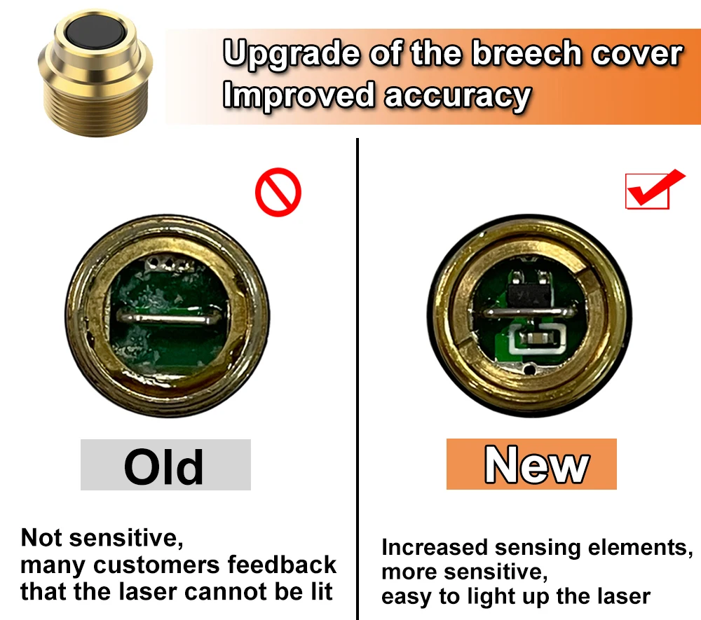 Эта новая модель имеет картридж на 1 мм длиннее, что делает его лучше в камере. С помощью этого зажигательного штифта не имеет больше зазора, который улучшает крышку кнопки и основание. Световая съемка кажется лучше с емкостным фильтром и транзистором, который запускает сигнал.