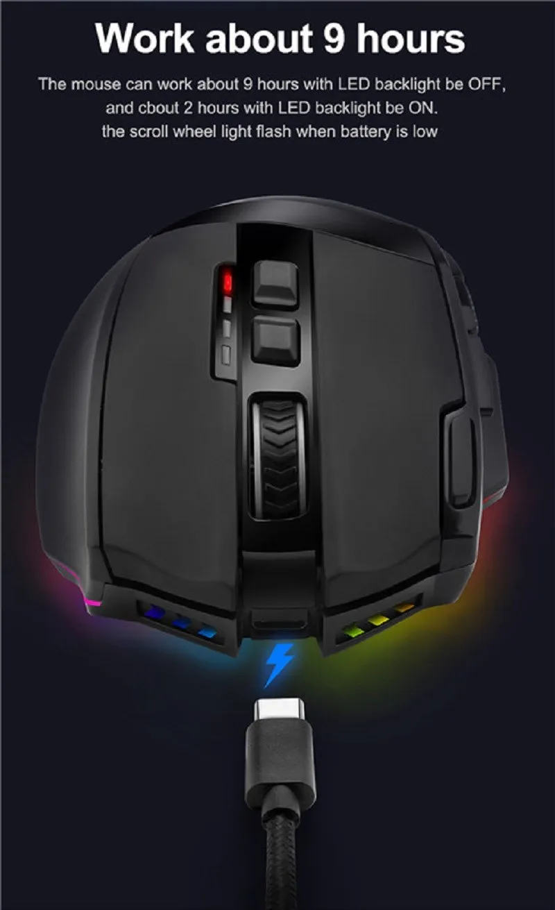 Профессиональная Проводная/Беспроводная игровая мышка; С супер быстрым lag бесплатным проводным или беспроводным подключением. Срок службы аккумуляторной мыши составляет до 35 часов (светодиодный RGB) и 70 часов (светодиодный RGB) после каждой зарядки. Профессиональные игровые функции 16000 настраиваемые DPI и ускорение 40g. Высокоточный датчик может обеспечить точное позиционирование и высокую скорость отклика в компьютерных играх или процессе редактирования компьютераПрограммируемая игровая мышь RGB с подсветкой; 8 световых эффектов, 10 уровней яркости, режим дыхания (подсветка может быть отключена), 9 программируемых кнопок пользователя, 2 боковые кнопки, кнопка быстрого запуска, 5 профилей хранения с макрозаписьюЭргономичная мышь обеспечивает чрезвычайно удобный и точный опыт для компьютерных игр.Функция игровой мыши; Rgb-мышь redragon m801p; Антироликовая, прочная гладкая тефлоновая Подушка, может воплотить в жизнь конечное управление игрой. 9 программируемых кнопок. Поставляется со съемным высокоскоростным кабелем usb-c с оплеткой 6 футов 3 ммСовместимость игровой мыши с ПК: Windows 10, Windows 8, Windows 7, Windows Vista или Windows XP,