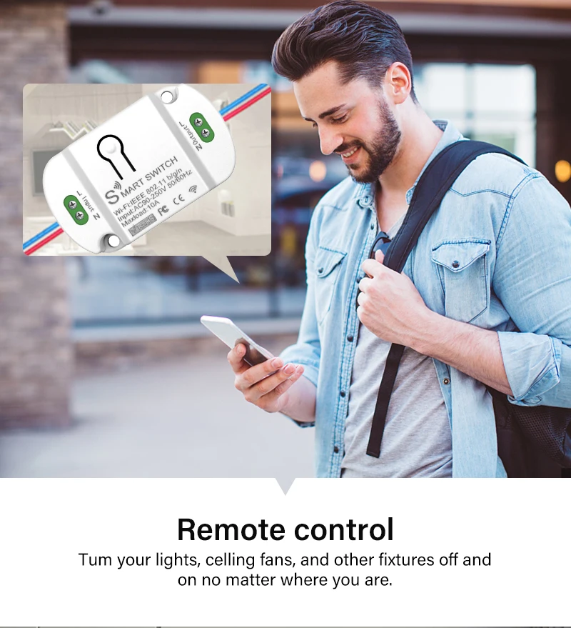 Поддержка дистанционного управления eWeLink и дистанционного беспроводного смарт-переключателя eWeLink, пульт дистанционного управления и удаленный умный беспроводной переключатель специально разработаны для eWeLink WiFi + удаленный умный переключатель. Они могут быть расположены там, где вы хотите быть (лучшее расстояние составляет 15 м). В соответствии с руководством, После сопряжения с смарт-переключателем, его можно управлять с помощью пульта дистанционного управления eWeLink и удаленного интеллектуального беспроводного переключателя.