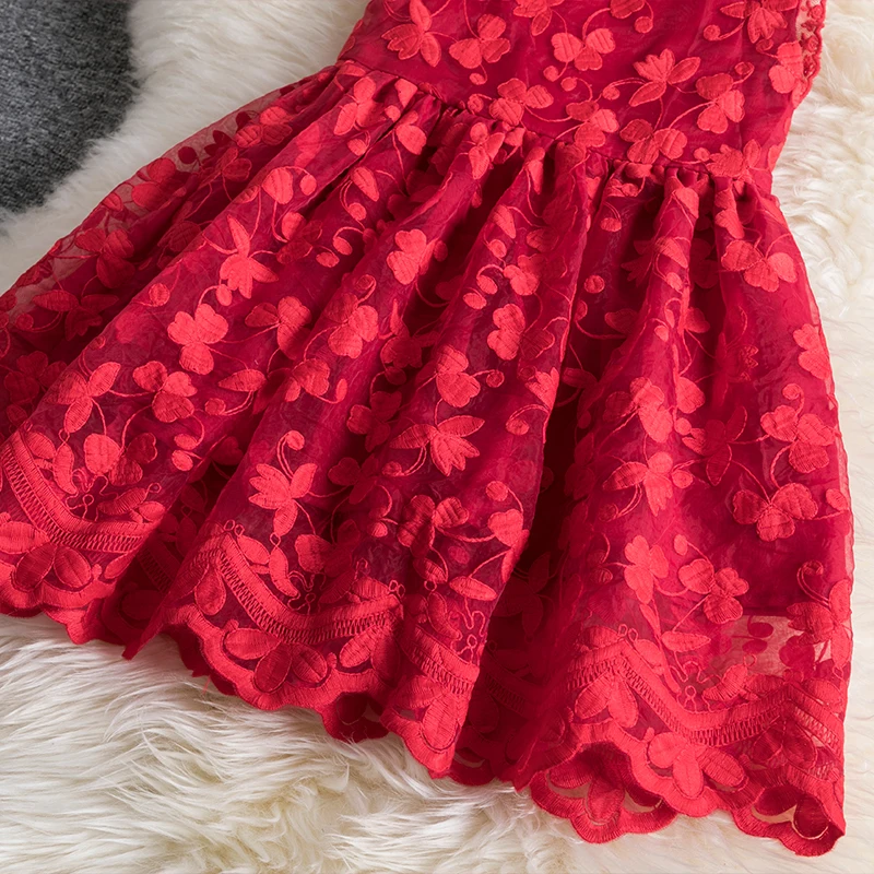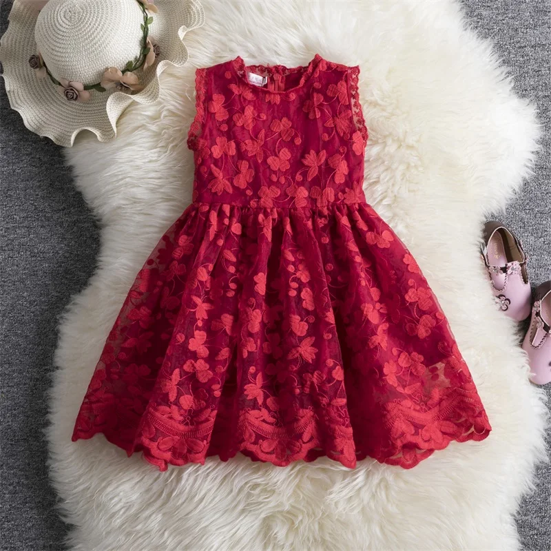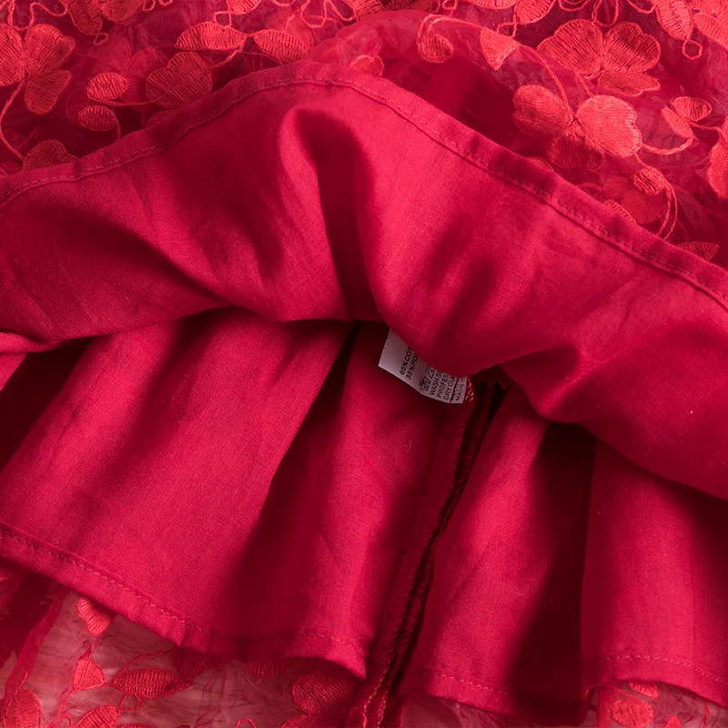 Платье для девочек, летнее, красное, с кружевной вышивкой