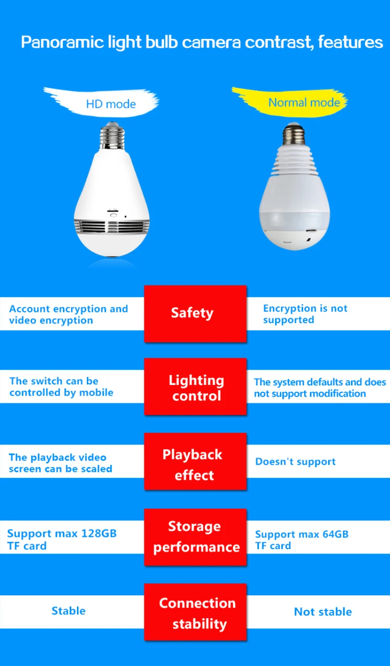 3. Простая система для установки, просто положив в общее сопло лампы. Это размер и форма обычного дискретного светодиодный лампы. Подключение к сети Wi-Fi и через приложение вы можете просматривать и взаимодействовать через ваш смартфон или планшет. Встроенный, само-говоря микрофон. Записывайте или фотографируйте в любое время на вашем телефоне или планшете (не входит в комплект micro sd). Разрешение: 960P.