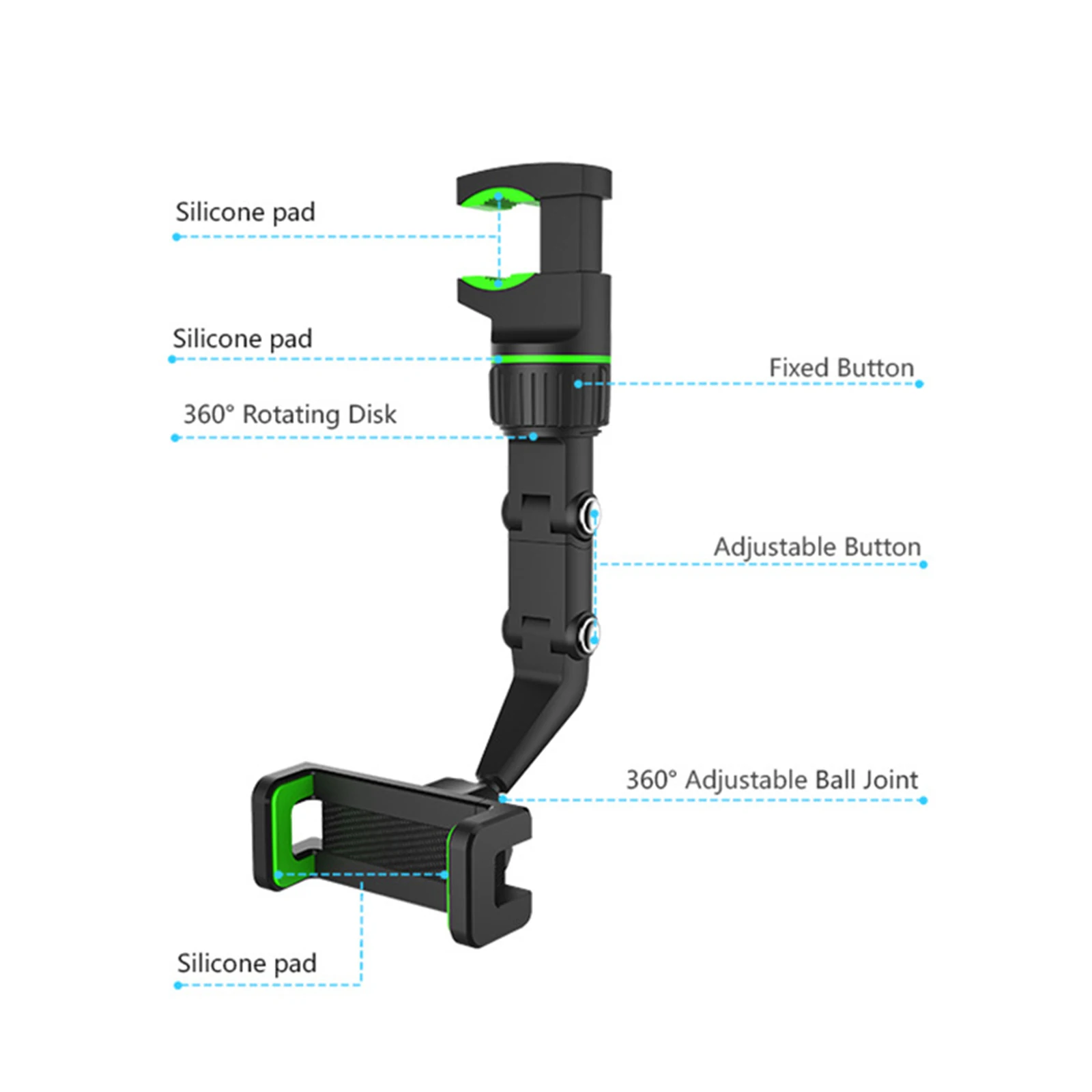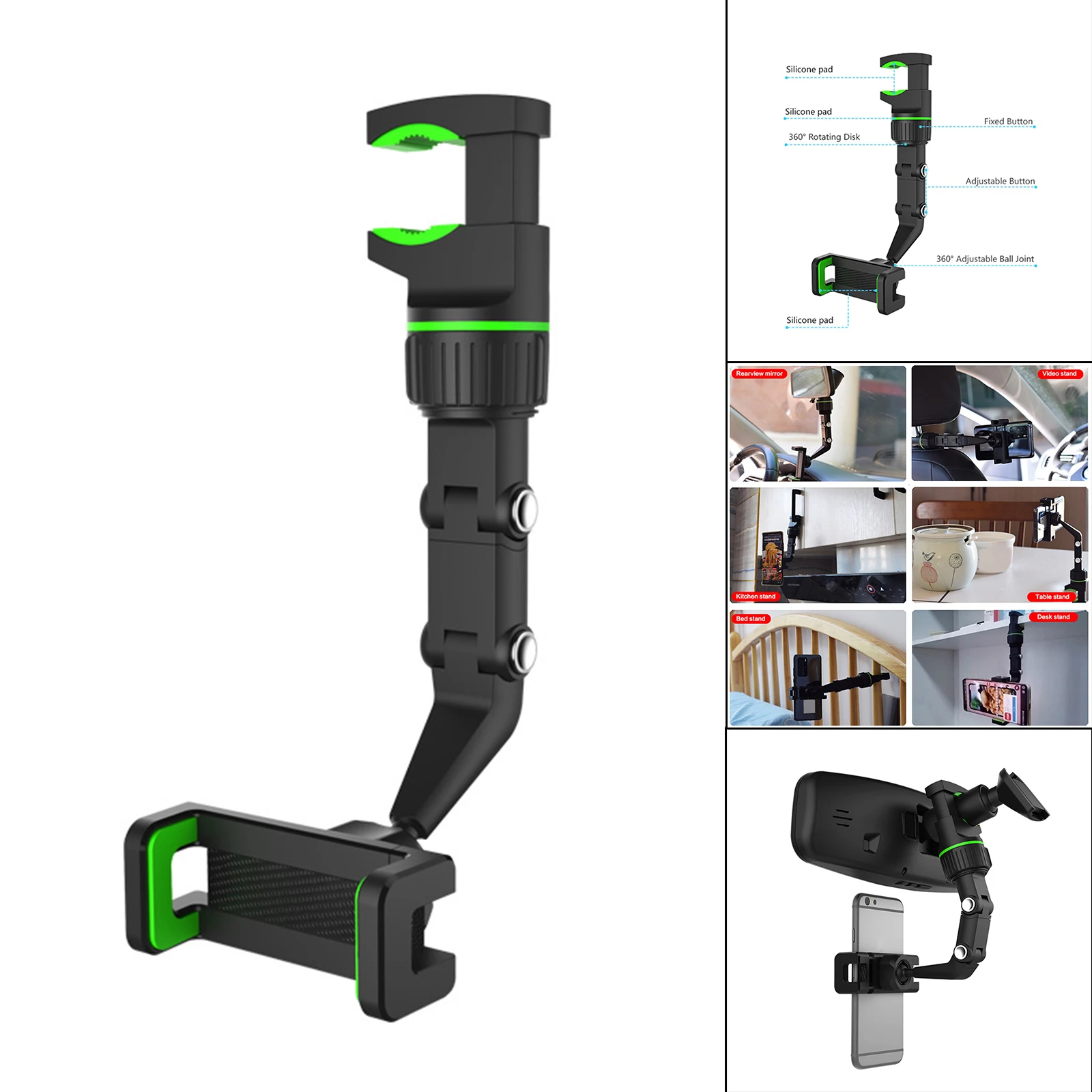 Многофункциональность: Автомобильный кронштейн для зеркала заднего вида, это также артефакт в задней части автомобиля, чтобы обговорить ребенка, научиться готовить на кухне, собирать за столом.Простота установки: конструкция с большим шагом, Быстрая блокировка, экономия времени и усилийБольшой размер: подходит для большинства мобильных телефонов на рынке, и позволяет вам зажимать его там, где вы хотите.Супер гибкий, 960 ° вращение по желанию, дает вам искренний уголСтабильная: металлическая краска нажимает вращающуюся кнопку, которая удобна и быстра, устойчива и не трясется