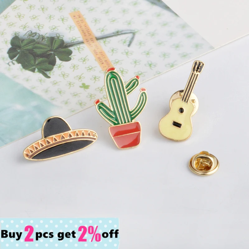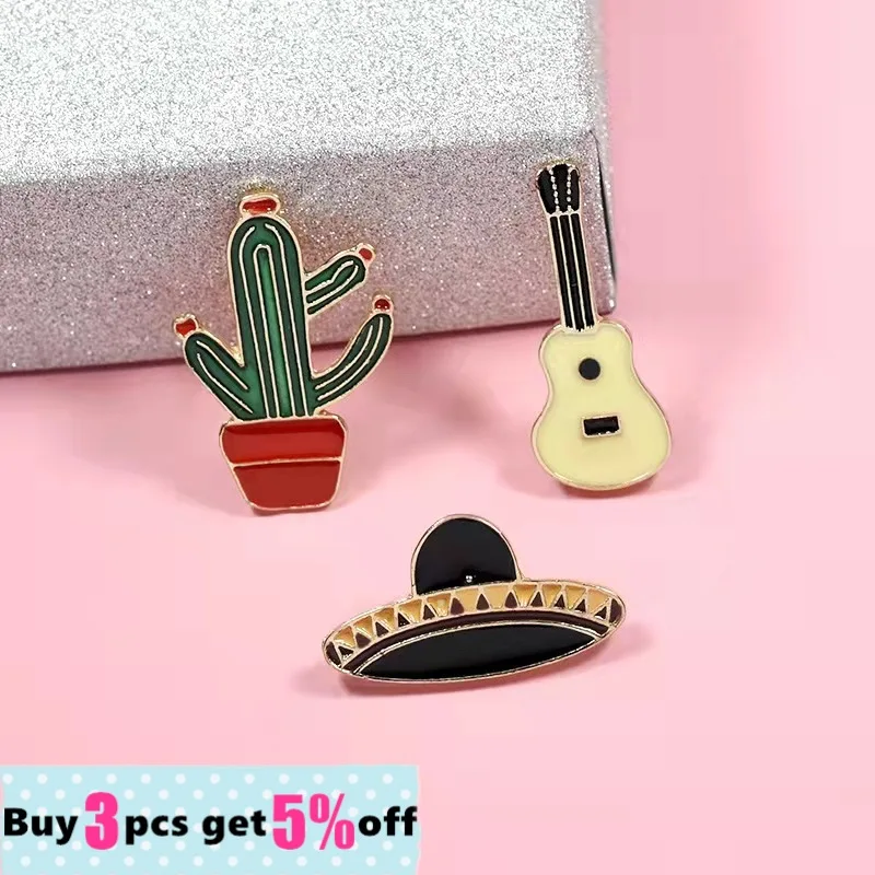 Оптовая продажа шляп гитара мексиканский кактус заколки жесткий эмалевый лацкан заколка для рюкзака джинсы шляпы кактус ювелирные изделия подарок для друга
