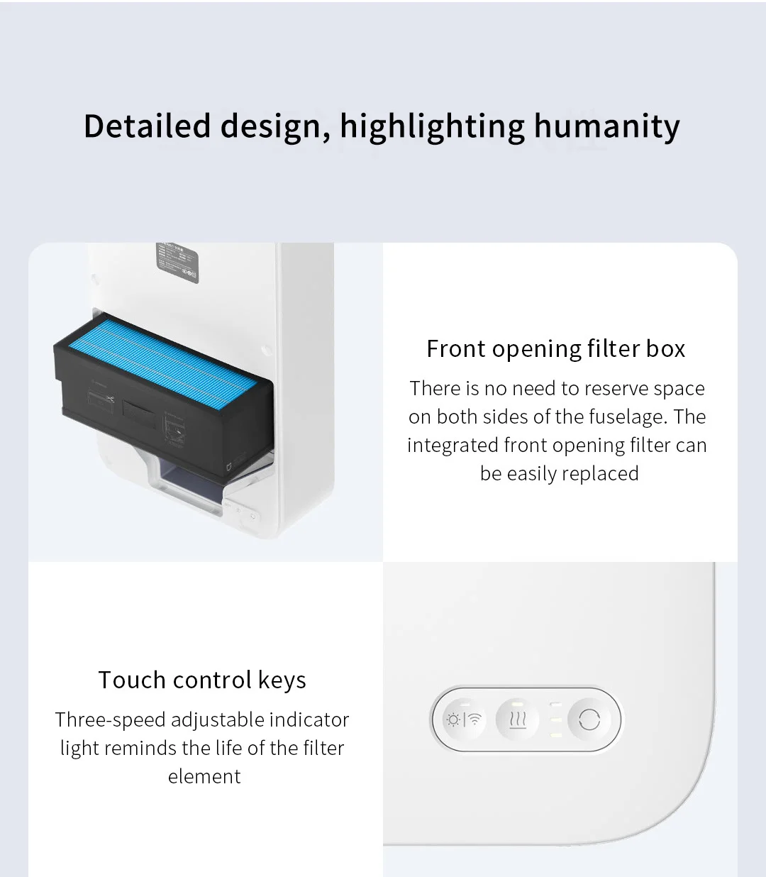 Передняя Коробка с отверстиемНет необходимости в запасе места с обеих сторон фюзеляжа, и интегрированный передний открывающийся фильтр можно легко заменитьСенсорные кнопки управленияНастраиваемые три шестерни, световой светильник напоминает о сроке службы фильтрующего элементаПластиковый гибкий каналВетряная труба является непромокаемой и антивозрастнойДиафрагма составляет всего 75 мм, и место установки можно выбрать гибко