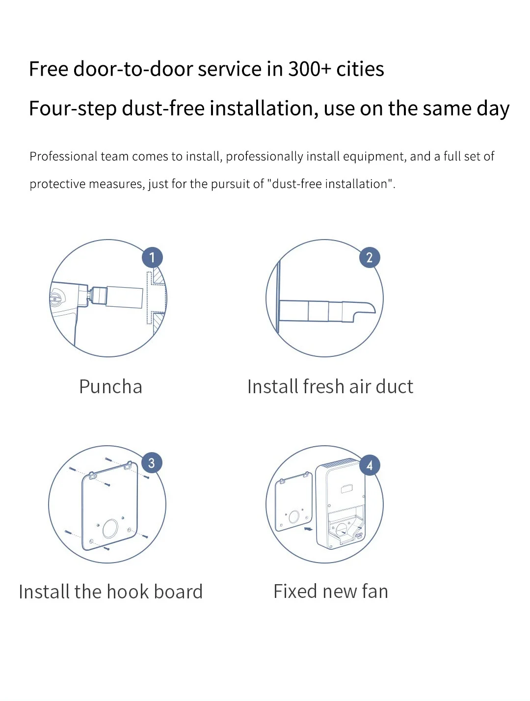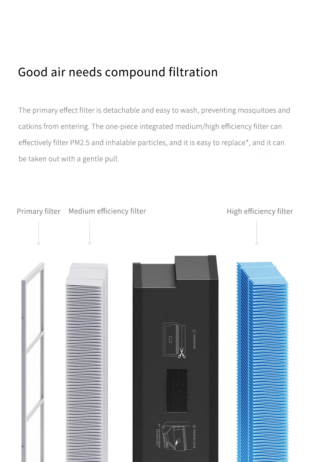 Несколько фильтров очищают воздух, входящий в комнату, чтобы увеличить давление воздуха в помещении, чтобы образовать слегка положительное давление. Циркуляция воздуха непрерывно разбавляет вредные газы, такие как формальдегид, PM2.5 и углекислый газ в помещении, и сбрасывает их через зазоры комнаты вместо открытия окон для вентиляции.