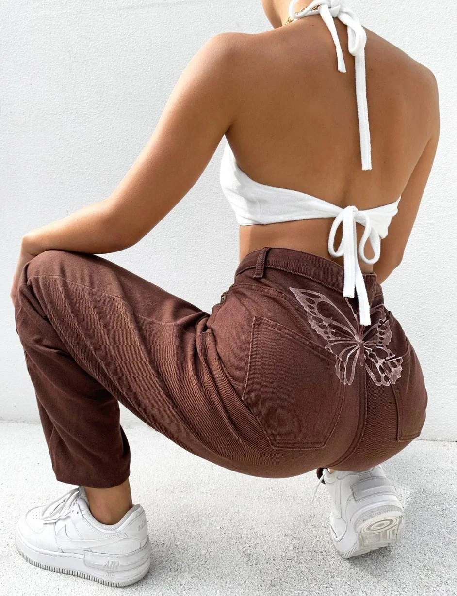 Прямые джинсы с принтом бабочки сзади, женские повседневные брюки с...