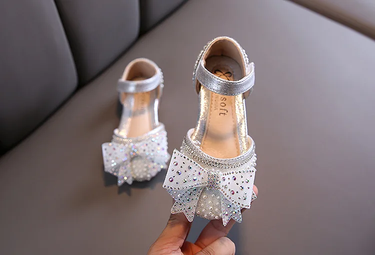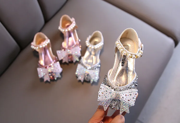 Туфли для девочек, кружевные, с блестками и бантом, с жемчугом