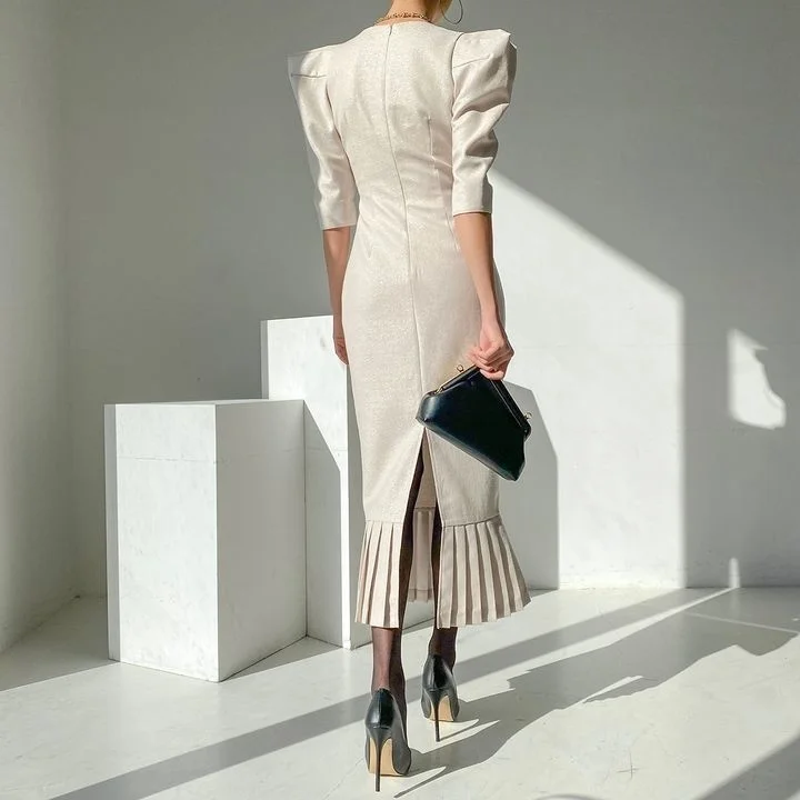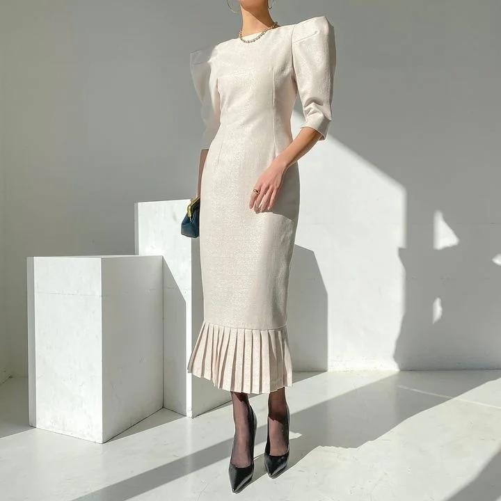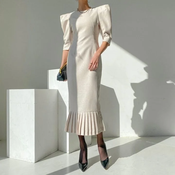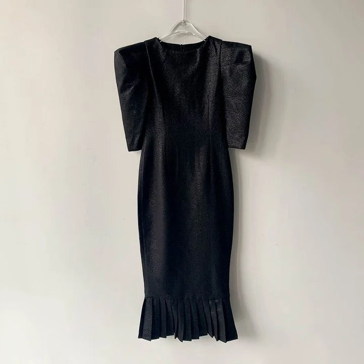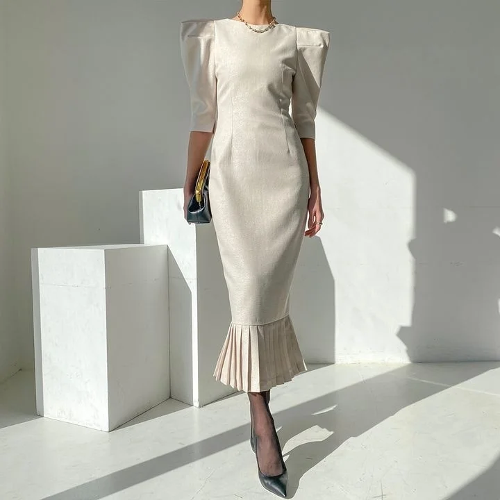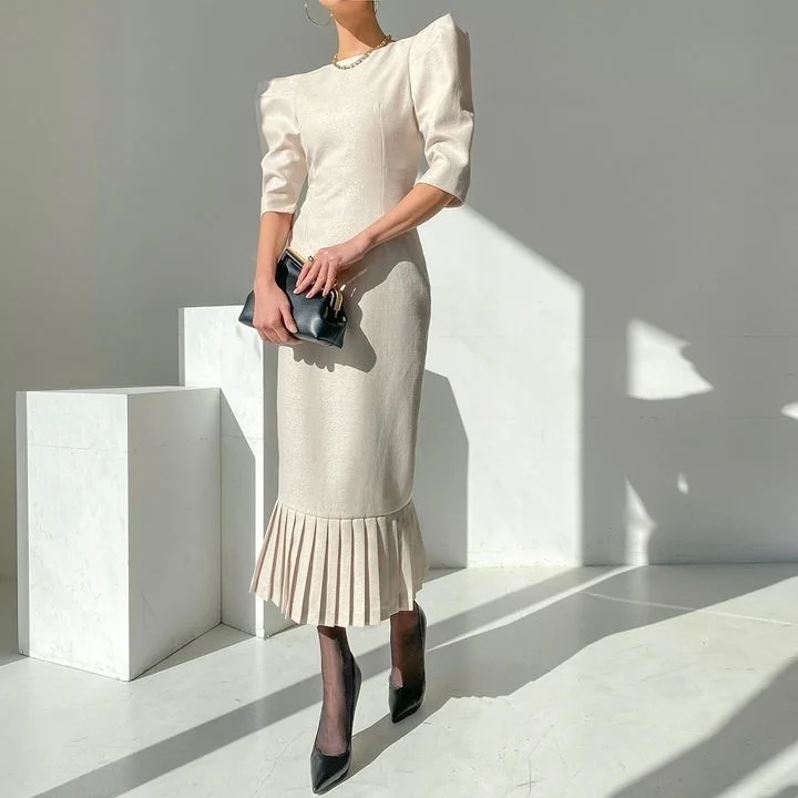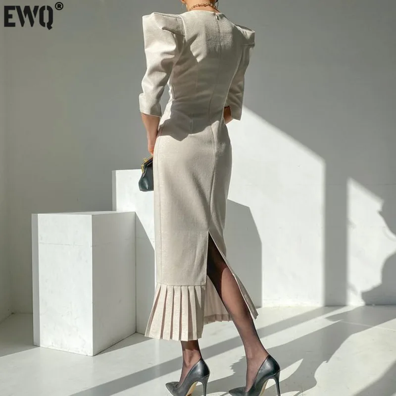 Женское платье с юбкой годе EWQ, черное плиссированное платье до середины икры с О-образным вырезом и рукавом до локтя, модель R1348 в Корейском стиле на весну 2022