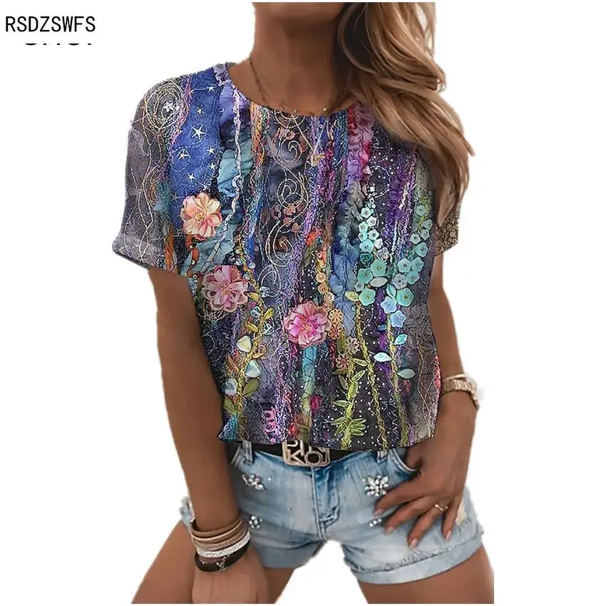 Женский модный топ с круглым вырезом и коротким рукавом, повседневный пуловер с цветочным принтом, летняя свободная Универсальная футболка большого размера