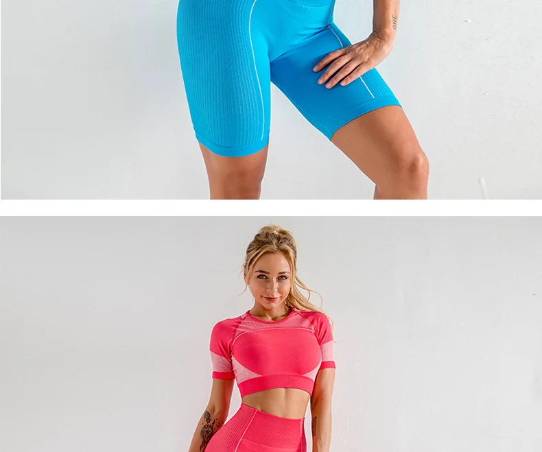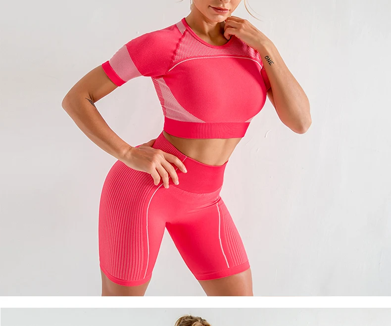 костюм спортивный женск Роскошный женский спортивный комплект из 2 предметов, бесшовная рубашка с коротким рукавом и шорты для подтяжки ягодиц, костюм для тренировок, фитнеса, Женский комплект