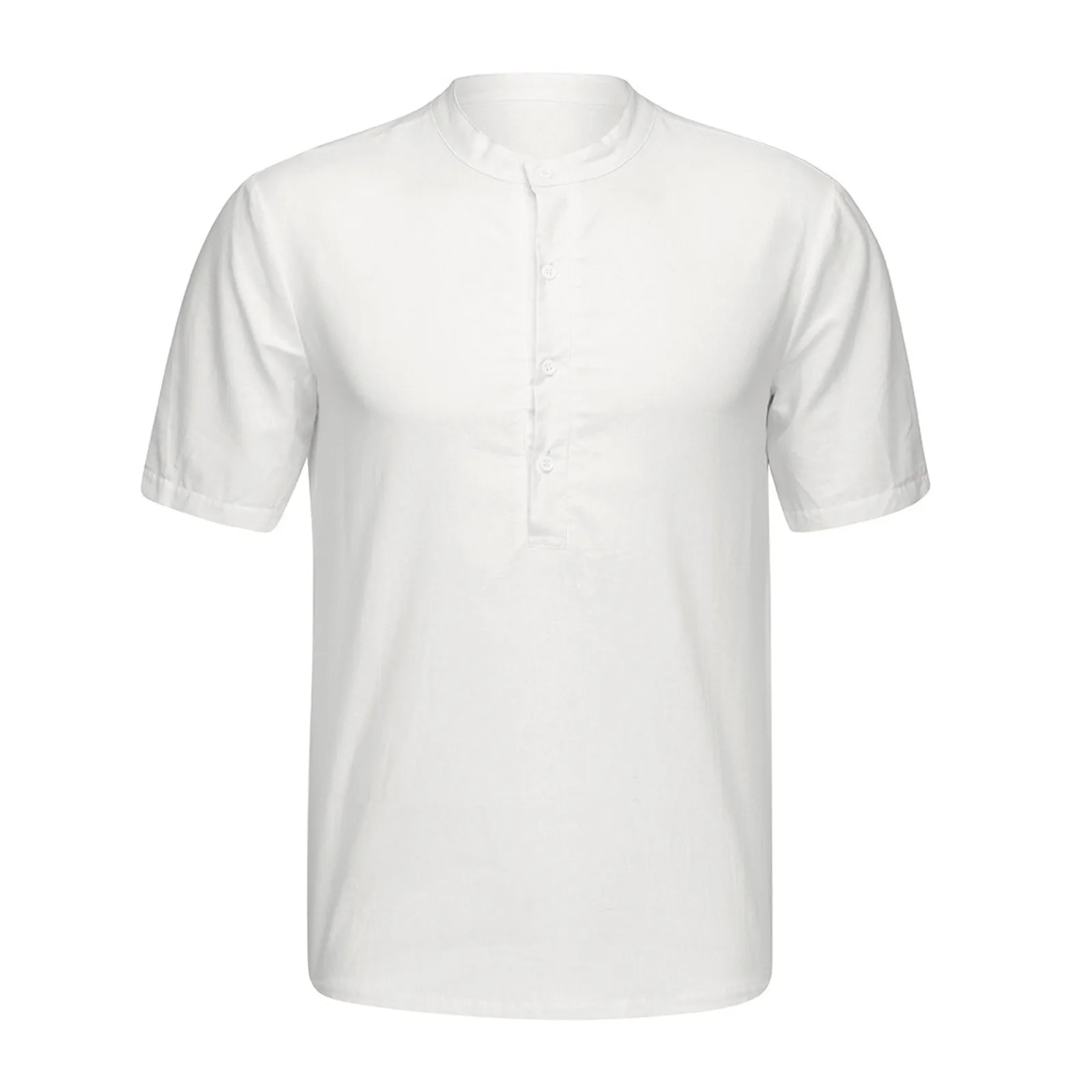 Мужская Летняя однотонная хлопковая льняная рубашка с короткими рукавами и воротником-стойкой на пуговицах