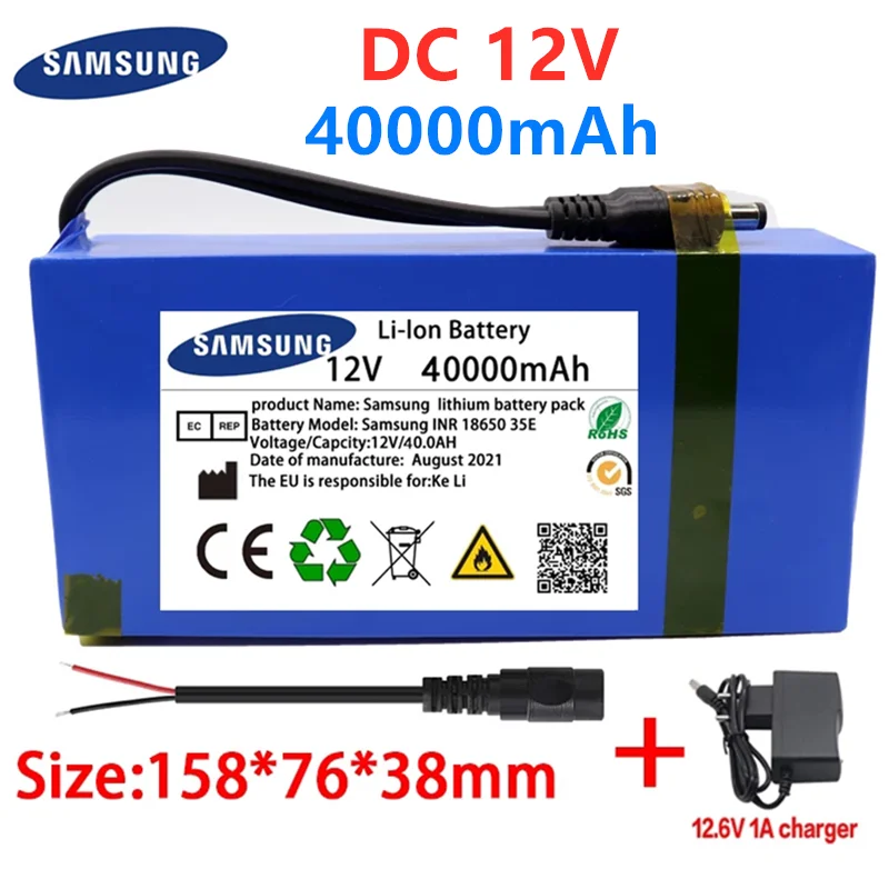 2022 Новый 12 В 18650 40000 мАч литий-ионный аккумулятор постоянного тока 12,6 в 40 Ач Аккумулятор с европейской вилкой + в 1 а зарядное устройство + кабель для шины постоянного тока