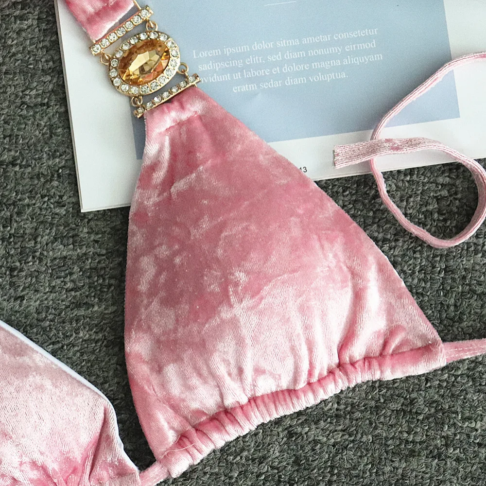 Комплект бикини с кристаллами, бандажный бархатный розовый купальник, купальный костюм, женский сексуальный купальник-бикини, бикини с золотыми кристаллами и камнями, пляжная одежда