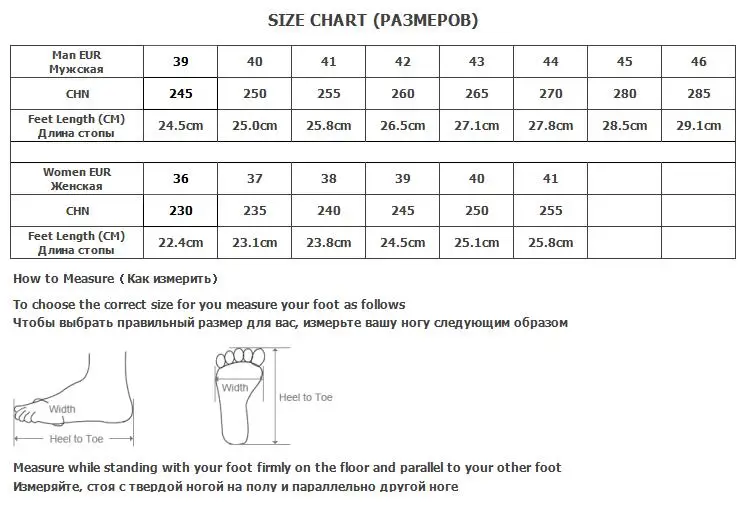 1. Пожалуйста, выберите правильный размер в соответствии с длиной Вашей стопы (от пятки до носка)2. Если у вас широкая или Толстая ступня, пожалуйста, выберите на один размер больше