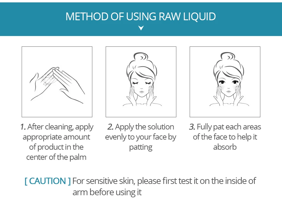 1. После очистки нанесите соответствующее количество продукта в центре ладони 2. Равномерно нанесите раствор на лицо, похлопывая 3. Полностью погладьте Каждый участок лица, чтобы помочь ему впитать [Внимание] для чувствительной кожи, пожалуйста, сначала проверьте его на внутренней стороне руки перед использованием