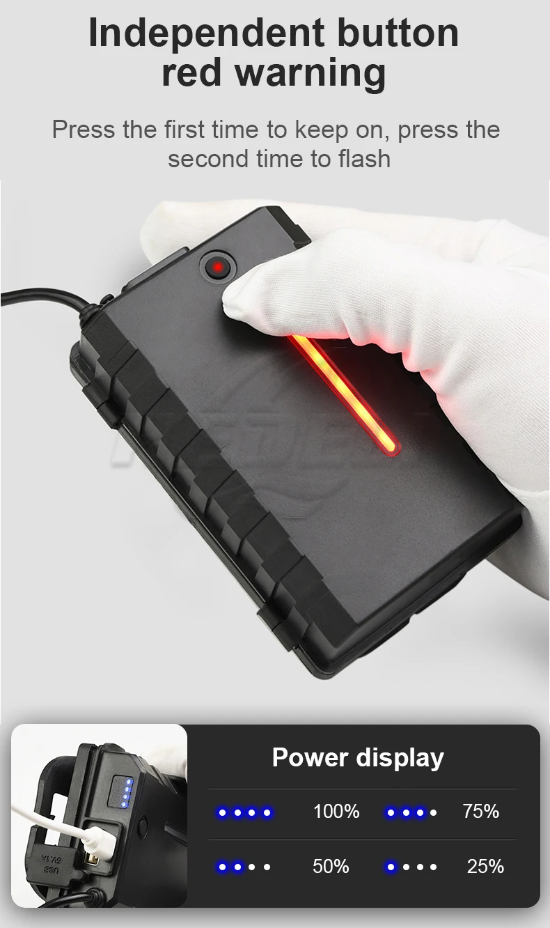 • Модель светодиодный бусины: 9 мм светодиодный s• Режим: 5 режимов (сильный светильник-средний Светильник-низкий светильник-SOS-Стробоскоп)• Цвет: черный• Материал корпуса: алюминиевый сплав• Товар Размеры: 11,5 см * 8 см * 5 см• Вес: 282 г• Время освещения: 5-10 часов• Время зарядки: 5 часов• Батарея: перезаряжаемая батарея 3*18650• Режим зарядки: зарядка через USB• Телескопический зум: Да• Мобильная мощность: Да• Дисплей питания: Да• Уровень водонепроницаемости: IPX-6• Применимые варианты: рабочие, охотничьи, рыболовные, спасательные, наружные и т. Д.