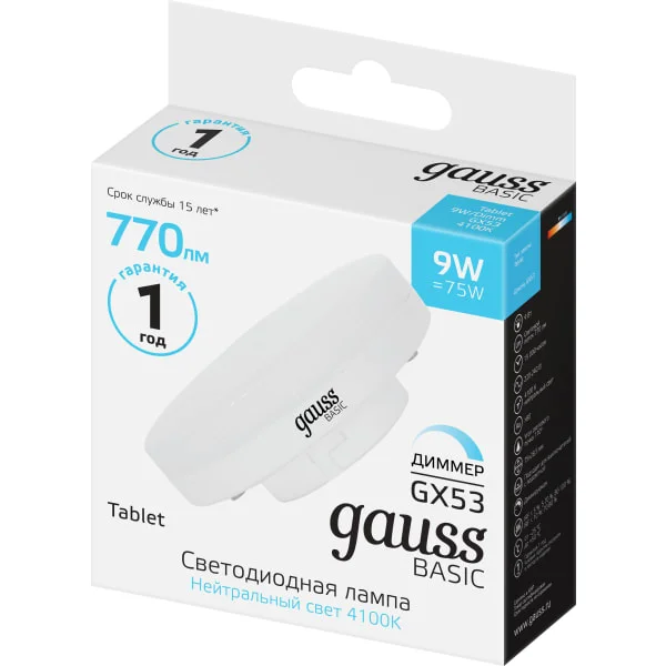 Лампа светодиодная Gauss Basic GX53 230 В 9 Вт диск матовый 770 лм, нейтральный белый свет, для диммера