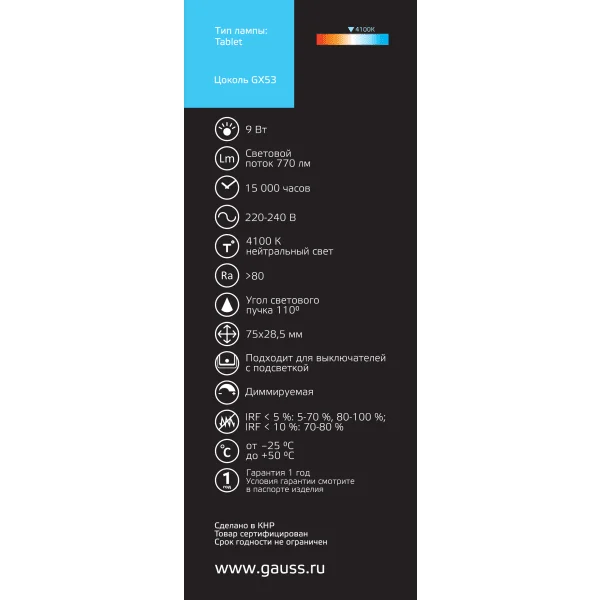 Лампа светодиодная Gauss Basic в форме таблетки — энергоэффективная и безопасная. Модель имеет цоколь GX53. Лампа совместима с диммером — возможно управление яркостью освещения. Дает нейтральный белый свет: цветовая температура — 4000 K.