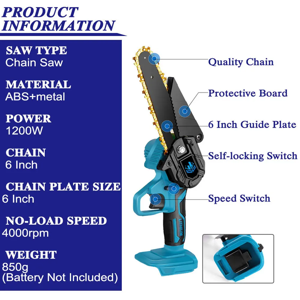 Электрическая пила 20 в, 6 дюймов, мини-пила для обрезки, для аккумулятора Makita 18 в, садовый электроинструмент для резки дерева, портативная цепная пила для деревообработки