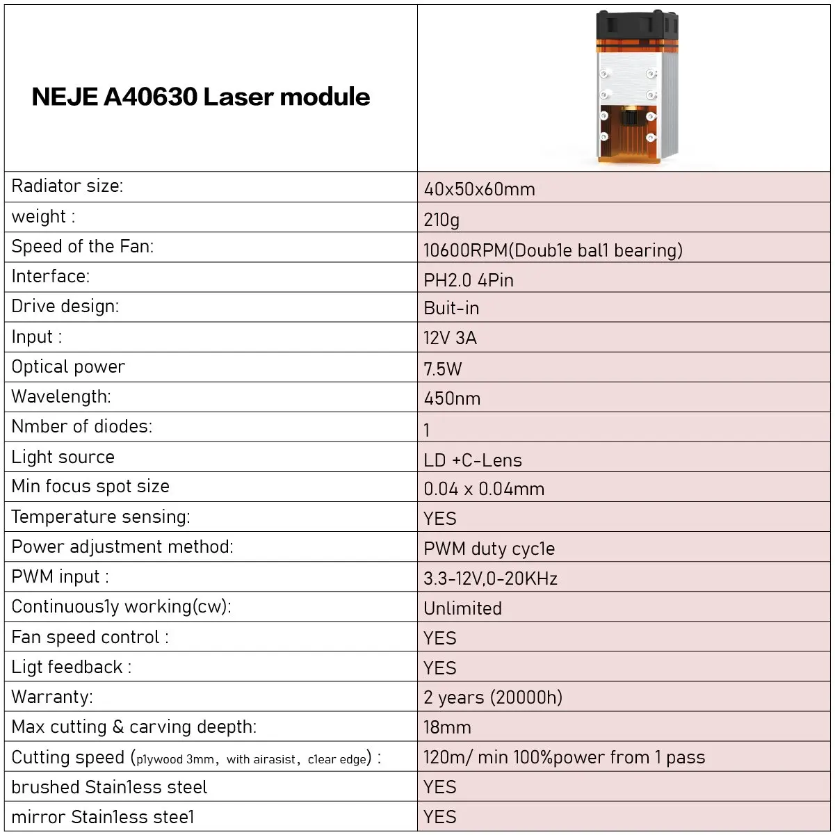 -Предназначен для лазерного гравера, 3D принтера, CNC мельницы, arduino проекта.-7,5 Вт оптический выходной мощности, 4 мм фанера от 1 проход (скорость 100), возможность гравировки нержавеющая сталь, но он нуждается в хорошем настройки фокусировки даже при фокусировке.-Более безопасное, встроенное Защитное стекло для защиты глаз! Даже не надев защитные очки, операция более комфортная.-Более тихий, умный привод регулирует скорость охлаждающего вентилятора в соответствии с лазерной температурой.-Простой в использовании, цифровой ШИМ Генератор импульсных сигналов с регулируемой частотой рабочего цикла для neje лазерного модуля.-Для легкой регулировки фокуса предусмотрена скользящая крепежная арматура.N40630 30 Вт Общая Спецификация:Модель: NEJE Module 30WМатериал радиатора: авиационный алюминий + латунный корпусСветящийся цвет: синийРазмер сечения: 40 мм x 40 ммРежим охлаждения: Интеллектуальный контроль датчика температуры + вентилятор охлаждения 10000 об/мин 40 ммРазмер: 60*40*40 ммРазъем адаптера: 5,5 2,1 портГравировка: МДФ/балса/бумага/дерево/ткань/пластик/кожа/Фанера/пенная бумага/анодированный алюминийНе выгравировать: металл/стекло/камень/керамика/PCB/нержавеющая сталь/светоотражающий материал/прозрачный материалТехнические параметры:Вход модуля: 20-30 ВтОптическая Выходная мощность: 7,5 Вт (7500 МВт)Длина волны: 455-450нмФорма луча: точка (фокусируемая)Рабочее напряжение: 12 В постоянного токаМодуляция TTL и PWM: Да, Совместимость с модуляцией TTL и PWMВходное напряжение: DC12V 3APWM/TTL Вход: DC3.3V-12VВходной интерфейс: PH2.0-4Pin (+,-, ШИМ/TTL, температура), 3Pin (+,-, ШИМ/TTL) , 2Pin + 2Pin (+,-) + (ШИМ/TTL,-)Примечание: Температурный интерфейс может быть отключен, NEJE предоставляет текстовые инструкции по приобретению температуры на wiki.Режим привода: внешний ACCБезопасный диапазон температур:<60 ℃Вес модуля: 202 г (чем легче вес, тем меньше инерция движения, тем лучше производительность)Срок службы: 10000-20000 часов