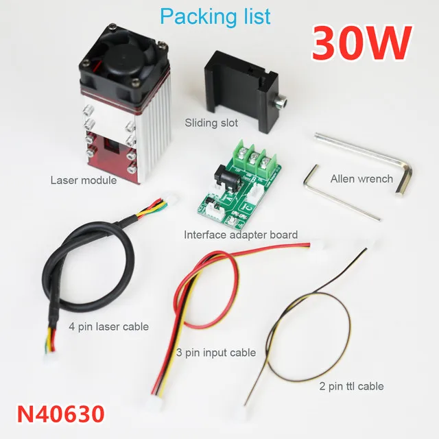 30 Вт лазерный модуль небольшие наборы посылка включает в себя:1x30 Вт модуль лазерной гравировки1 x лазерный модуль раздвижной арматуры1 x 4-контактный кабель (300 мм спортивные кабель)1 x NEJE цифровой ШИМ волновой Генератор импульсных сигналов регулируемая плата1x2,5 мм Г-образный ключ, дюймовый стандарт1 х 5 мм l-образный ключ(В комплект не входит блок питания 12 В 3 А и очки)