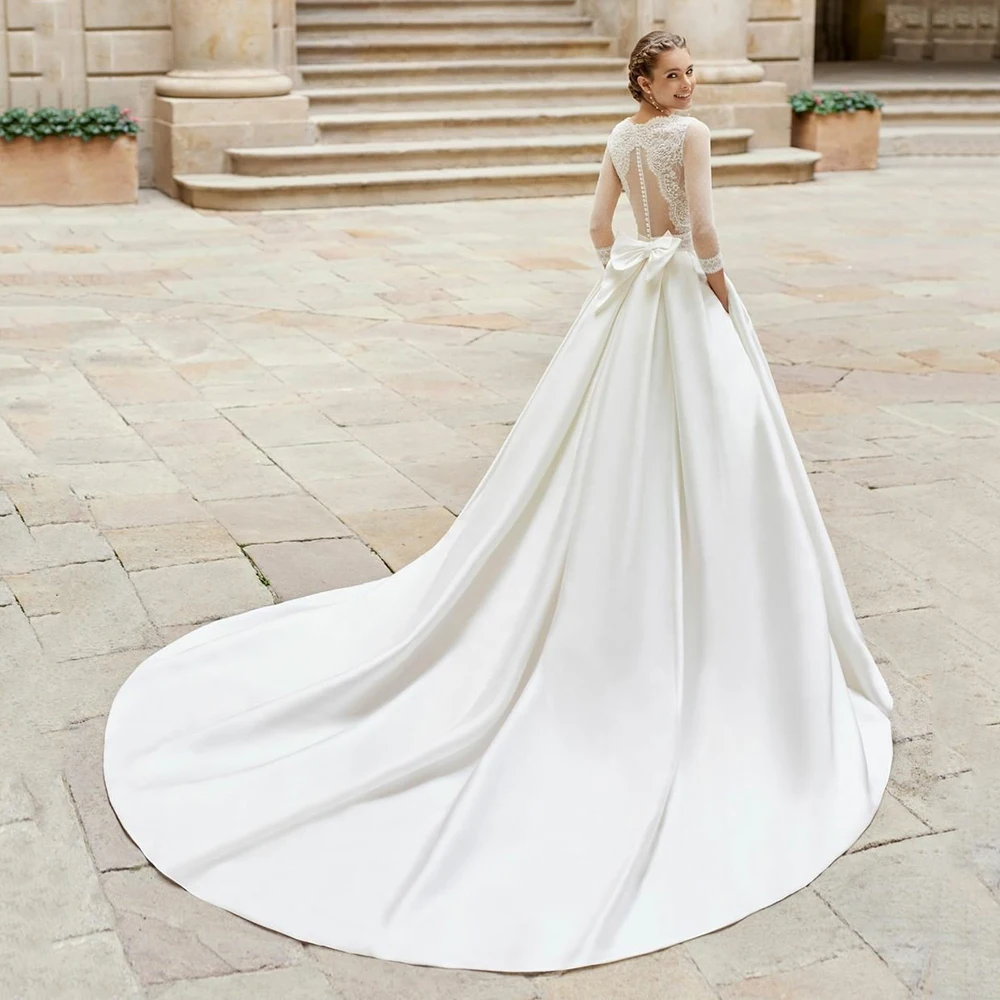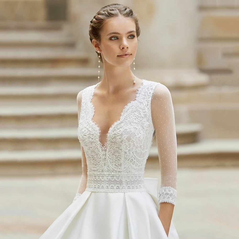 Кружевная атласная юбка UZN, свадебные платья в стиле бохо с V-образным вырезом и длинными рукавами, платья невесты с карманами и бантом, свадебное платье, бальное платье