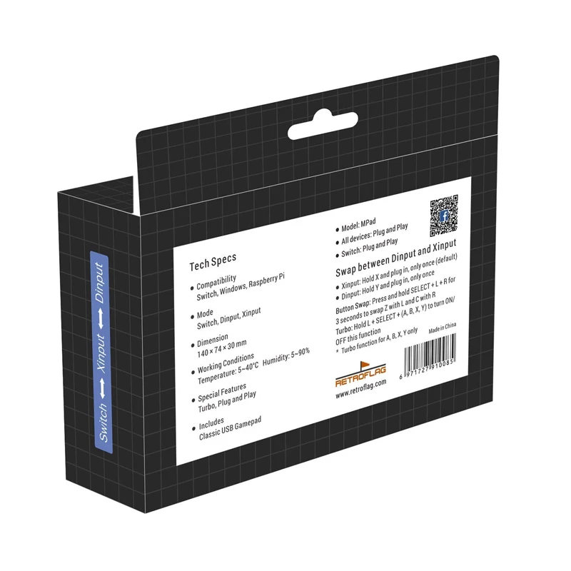 Особенности:Модель: MPadВсе устройства: подключи и работайПереключатель: подключи и работайПоддержка XINPUT, режим DINPUT и функция TurboXINPUT: удерживайте X и подключите, только один раз (по умолчанию)DINPUT: удерживайте Y и подключайте, только один разТурбо: удерживайте выбор + L +(A,B,X,Y), чтобы включить/выключить эту функцию (функция Turbo только для A,B,X,Y)Совместимость с Raspberry Pi, Windows(Window 7/8/10), Switch, macOSРазмер: 140x74x30 мм