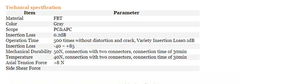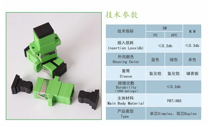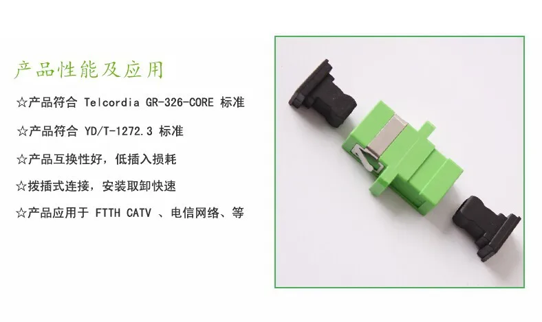 Стандартный Волоконно-оптический адаптер (волоконно-оптический фланец/соединительные муфты)-это пассивное волоконно-оптическое устройство, предназначенное для соединения между двумя соединителями. Существует множество адаптеров высокой точности, низкой потери вставки, превосходной долговечности, отличного соединения и адаптируемости к температуре. Эти адаптеры типа SC также имеют хорошую производительность в оптических и механических и широко используются в оптической распределительной оправе (ODF), коммуникационном и измерительном оборудовании.
