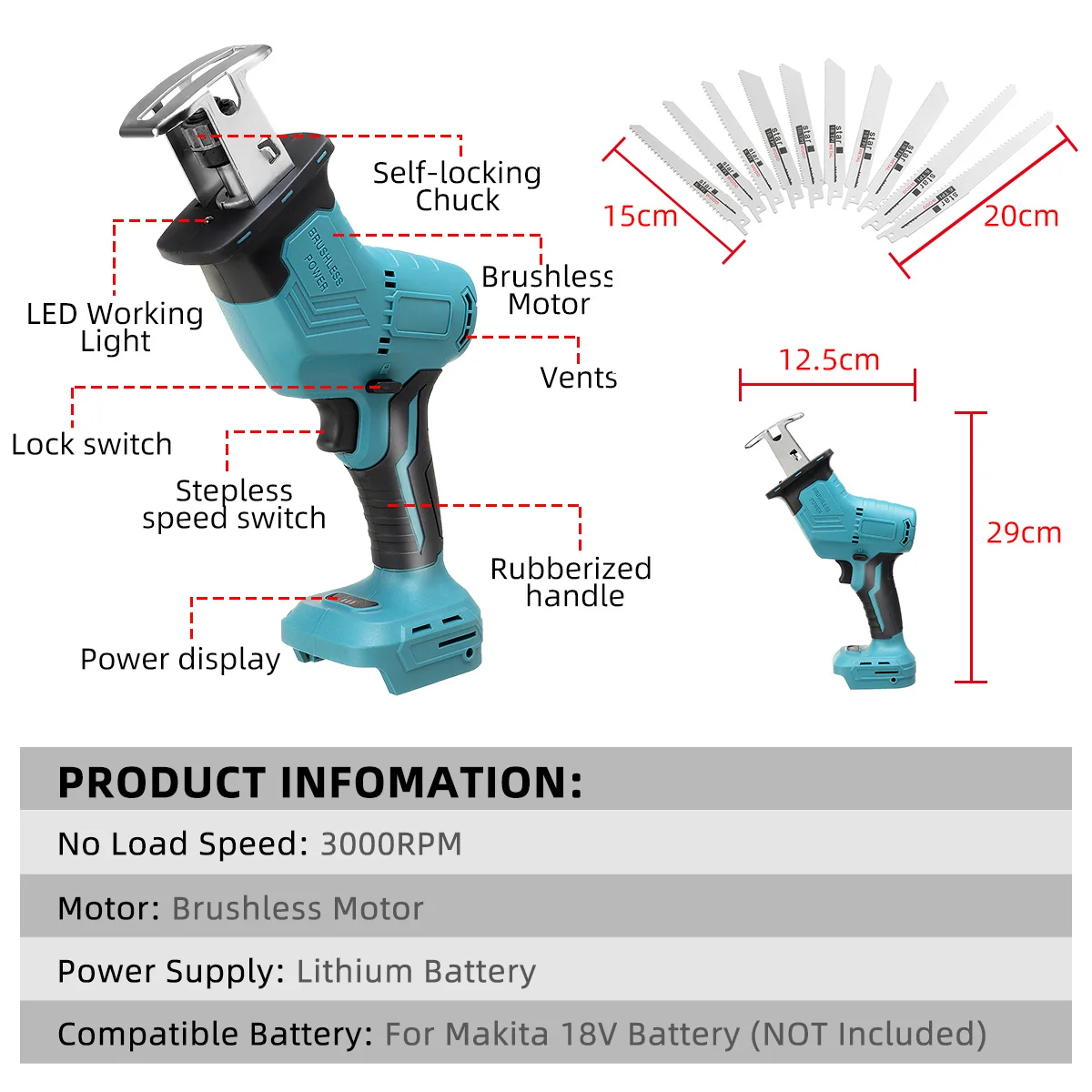 Особенности:-Дизайн литиевой батареи, легко носить с собой, долгое время работы в режиме ожидания (не включая батарею).-Быстрый и легкий выбор лезвий.-Идеально подходит для работы в ограниченном пространстве.-Переключатель безопасности, двойная изоляция, безопасная для эксплуатации.-Подходит для распиловки дерева, пластика, железного листа и т. д.