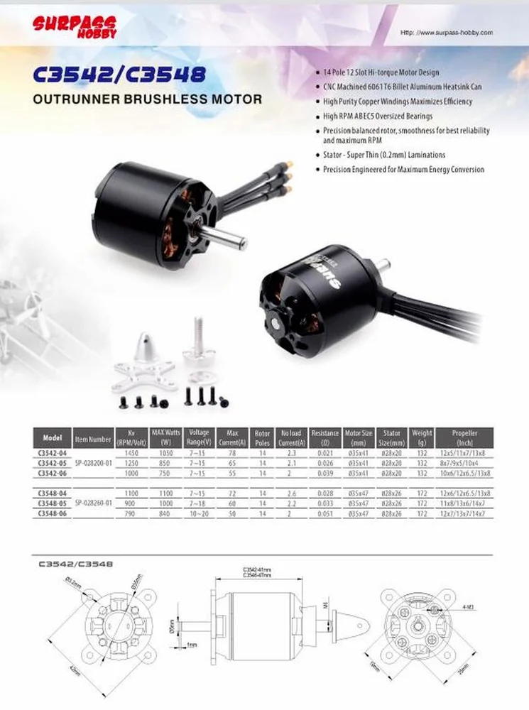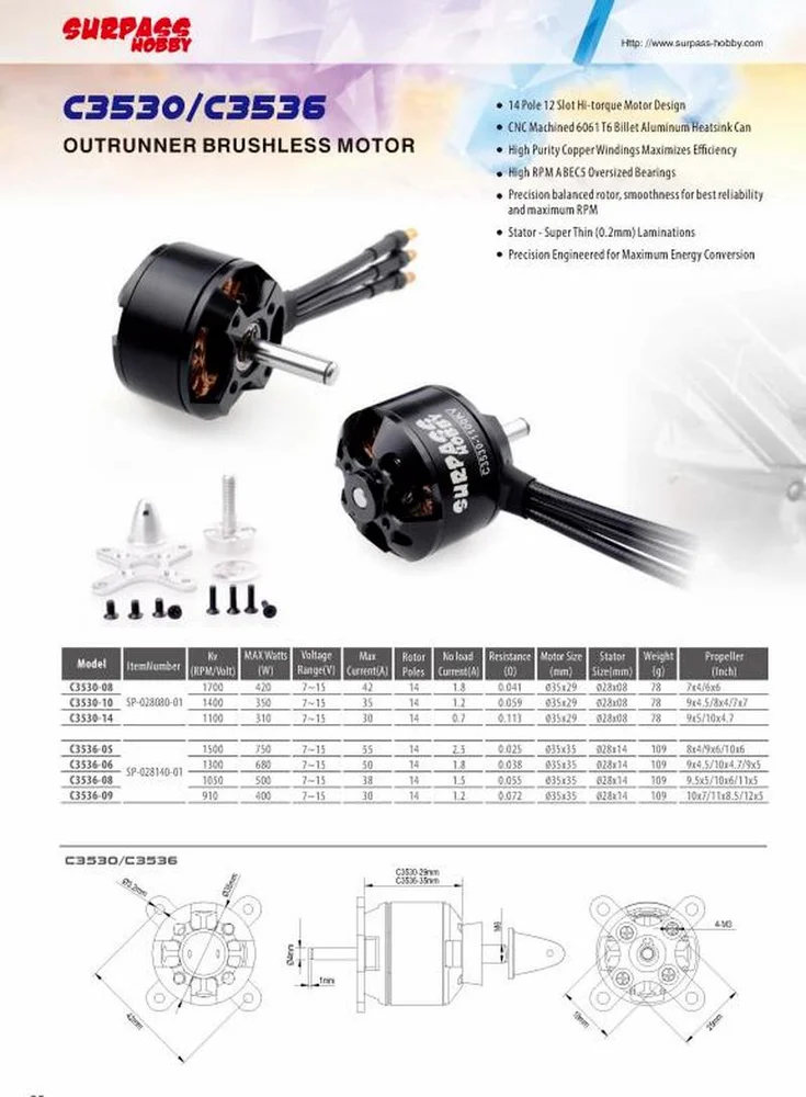 C3530 (2808): Материал: металл КВ: 1100кв/1400кв опционально Мощность: 350 Вт Напряжение: 7-15 в Ток: 35A Полюс: 14 Ток нагрузки: 1,2 A Размер двигателя: прибл. 35*30 мм Размер статора: прибл. 28*8 мм Разъем: 3,5 мм банановый штекер Тип: деталь модели RCC3548 (2826): КВ: 900кв Максимальная мощность: 1000 Вт Максимальный ток: 60A Полюсы ротора: 14 Ток без нагрузки: 2A Сопротивление: 0.033Ω Размер двигателя: 35x48 Размер статора: 28x26 Тяга: 1780 г Размер двигателя (мм): Ф35*48 Аккумулятор: 2-5S Lipo Опора (дюйм):11*8/13*6/14*7