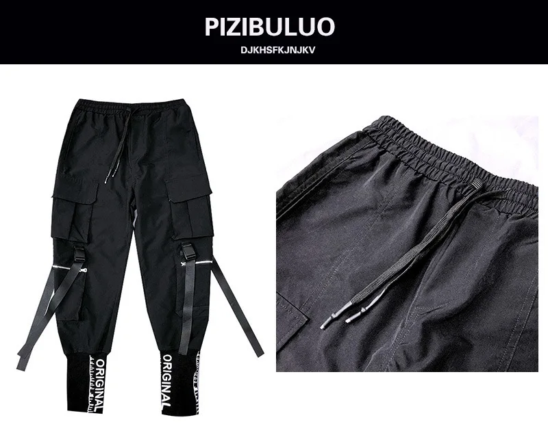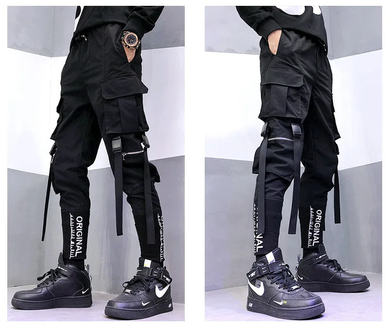 Мужские брюки-карго, Джоггеры в стиле хип-хоп, с несколькими карманами, черная уличная одежда, брюки-карго с лентами, модные спортивные штаны для мужчин