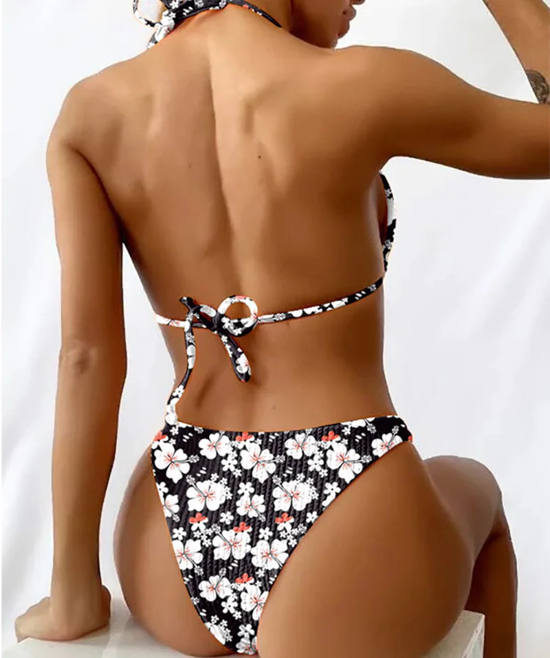 Сексуальный купальник с лямкой на шее, цветочный принт, Женский ком...