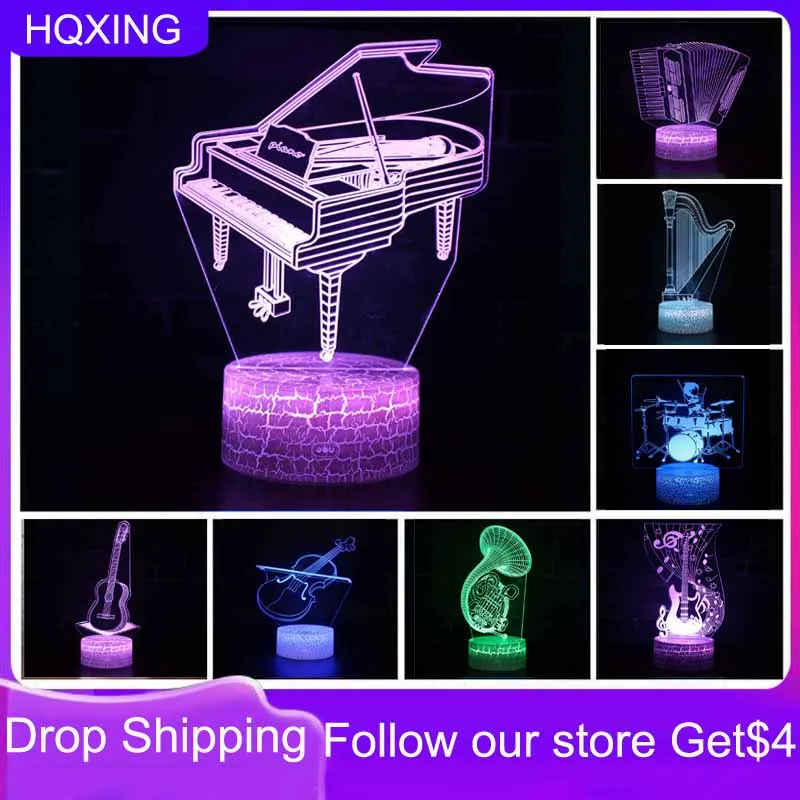 Ночсветильник HQXING с 3D иллюзией, светодиодный, USB, 7 цветов, музыкальный инструмент, ночная лампа, скрипка, рожок, фортепиано, гитарные лампы, детские подарки