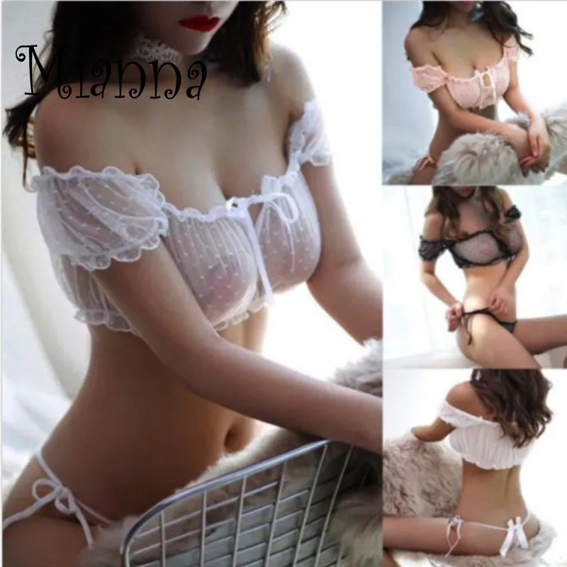 Женская белая прозрачная пижама в стиле "Лолита", бандажные стринги, комплекты нижнего белья, топ + стринги, одежда для сна, 2 шт., Милые стринги