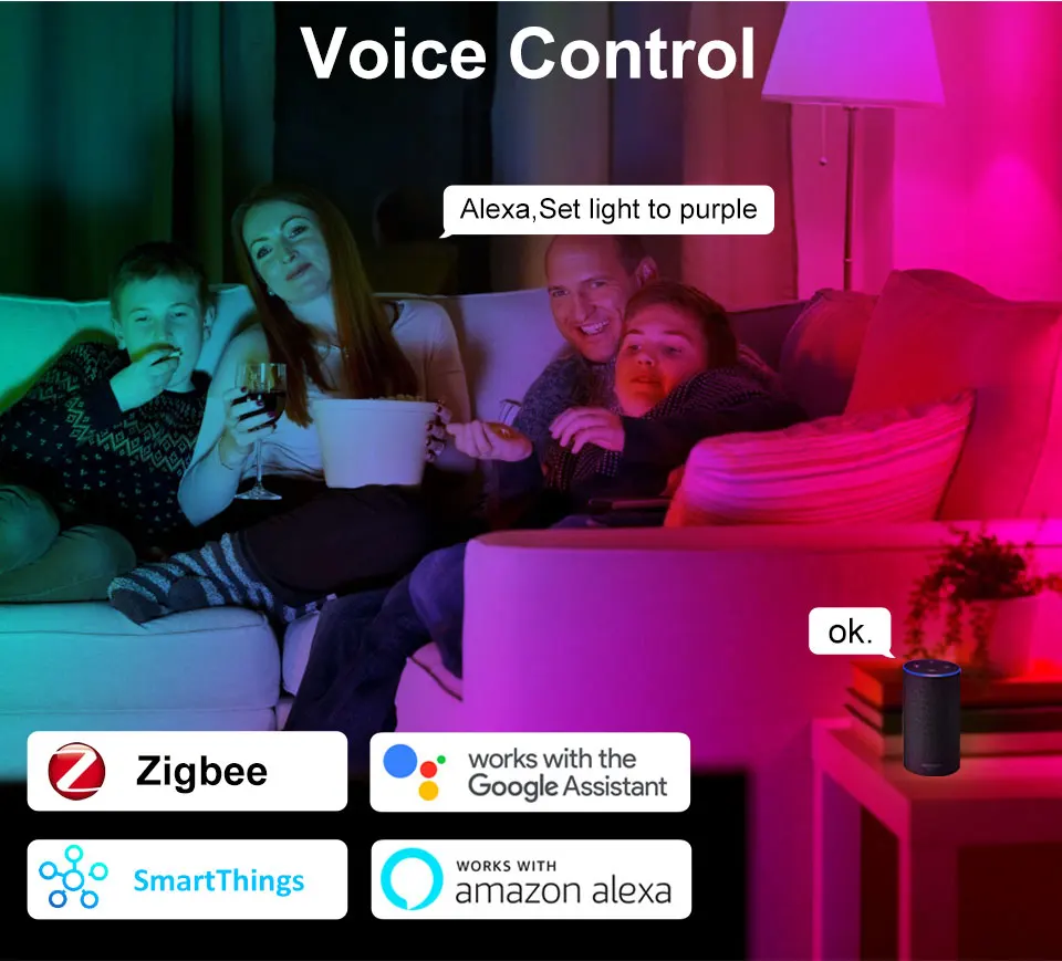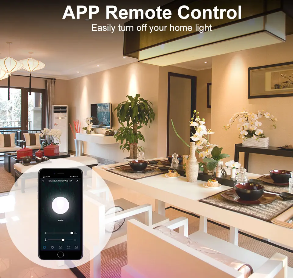 Пульт дистанционного управления:Включение/выключение Siri ,Alexa, google home включило умную лампу, независимо от того, находитесь ли вы дома или далеко. Вам просто нужно загрузить приложение «Умная жизнь». Вы можете создать группу для всех ваших умных ламп и управлять ими с помощью только одной команды.