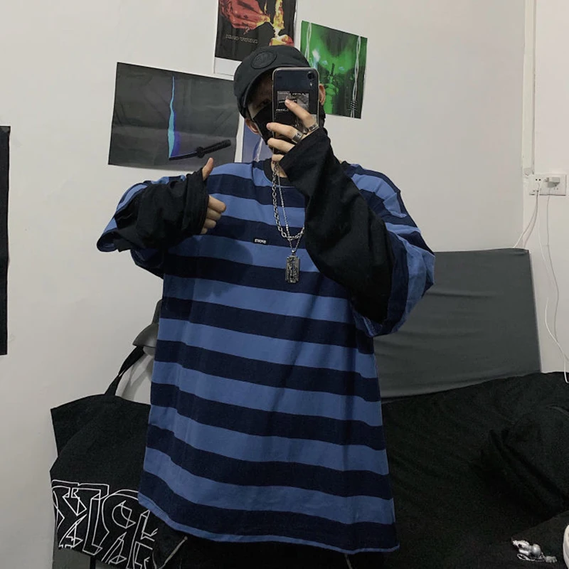 Имитация двух синих и зеленых полосок в винтажном Корейском стиле, модный тренд для мужчин, свободный принт, осенняя одежда для подростков, Новинка