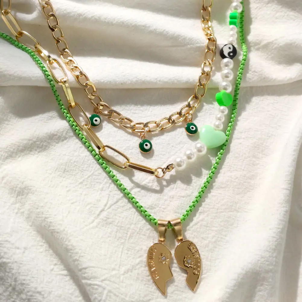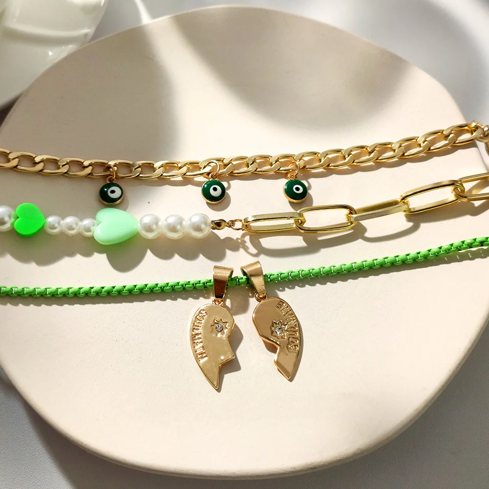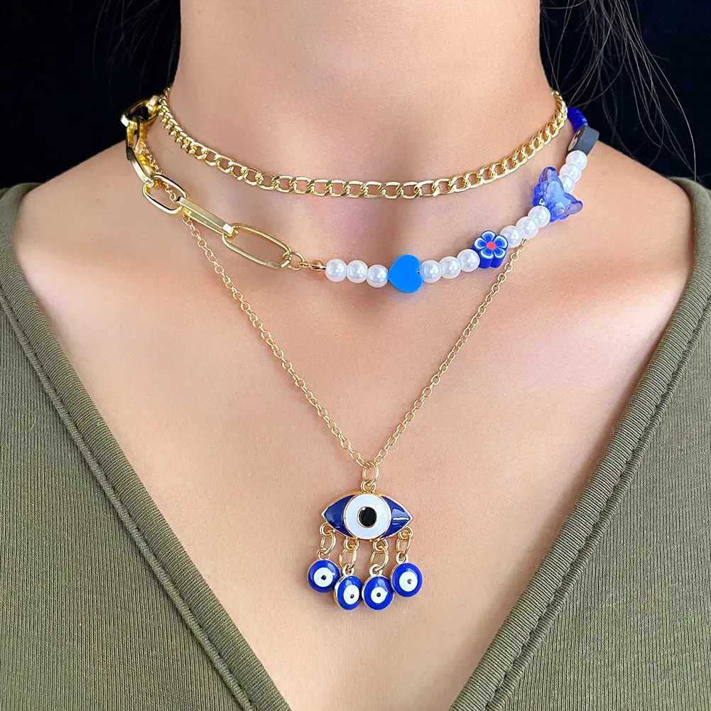 Ожерелье женское многослойное с жемчугом и подвеской в виде сердца и сглаза