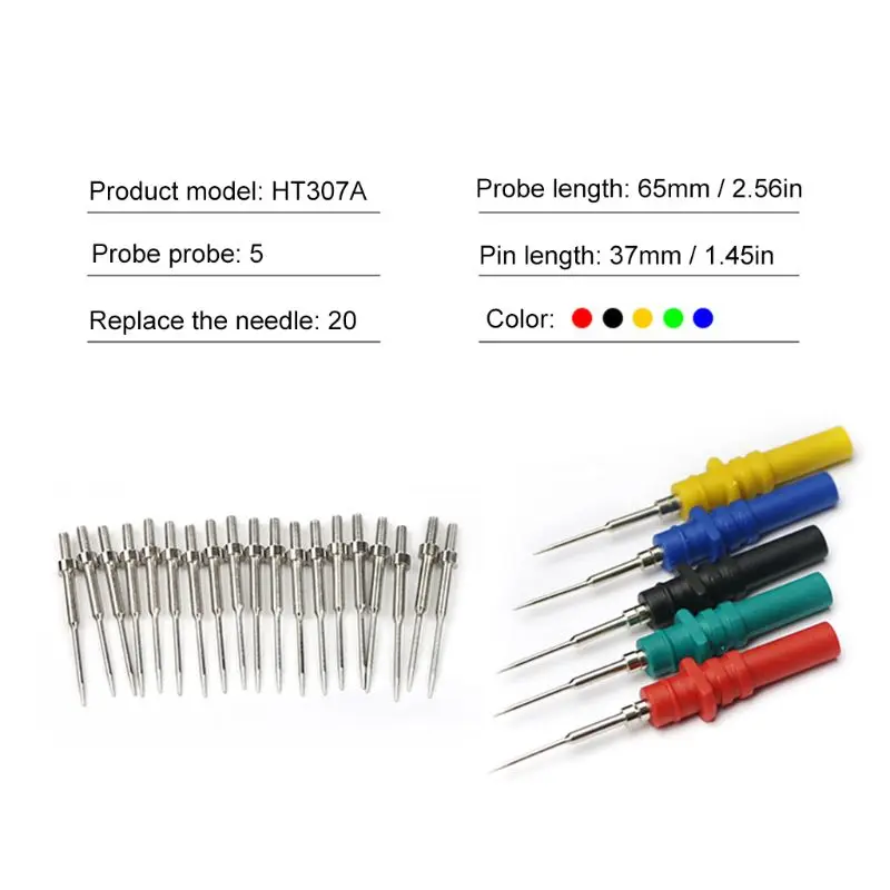 Обновление 5 шт. HT307A автомобильный осциллограф акупунктурный зонд контакты диагностический тест Инструменты для ремонтаOOTDTYСпецификация:Абсолютно новыйЦвет зонда: красный, черный, желтый, зеленый, синийДлина зонда: прибл. 65 мм (2,56 дюйма)Длина ступни: прибл. 37 мм (1,45 дюйма)Характеристика:Поставляется с 20 шт Запасные иглы.Тонкий наконечник может скользить через уплотнения пакета погоды к разъемам зонда.Может использоваться в качестве зонда с контактным наконечником во время работы с небольшими монтажными платами.Его небольшой диаметр, дополнительная острая булавка делает его хорошим для пирсинга изоляции на небольших измерительных проводах.В качестве акупунктурных зондов они используются для пирсинга изоляции проводов, чтобы обеспечить автомобильные электрические измерения без повреждения проводов.Прост в использовании.Прочный в использовании.Посылка включает в себя:5 шт х зонд20 шт. x сменная иглаПримечание:Возможны отклонения в 1-3 мм вследствие измерений вручную.Цвет товара на фотографиях может слегка отличаться на разных мониторах компьютера так как мониторы откалиброваны по-разному.