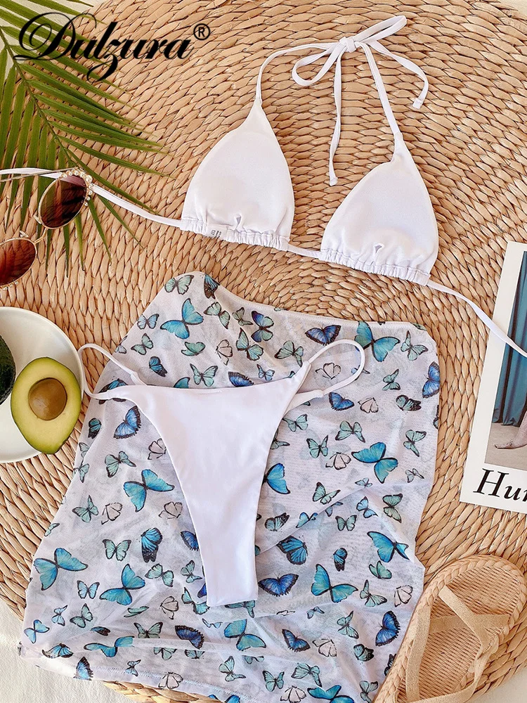 Dulzura 2022, женский бикини, комплект из 3 предметов, на шнуровке, короткий топ на бретельках, на завязках, с рюшами, с принтом бабочки, мини-юбка, костюмы для пляжа