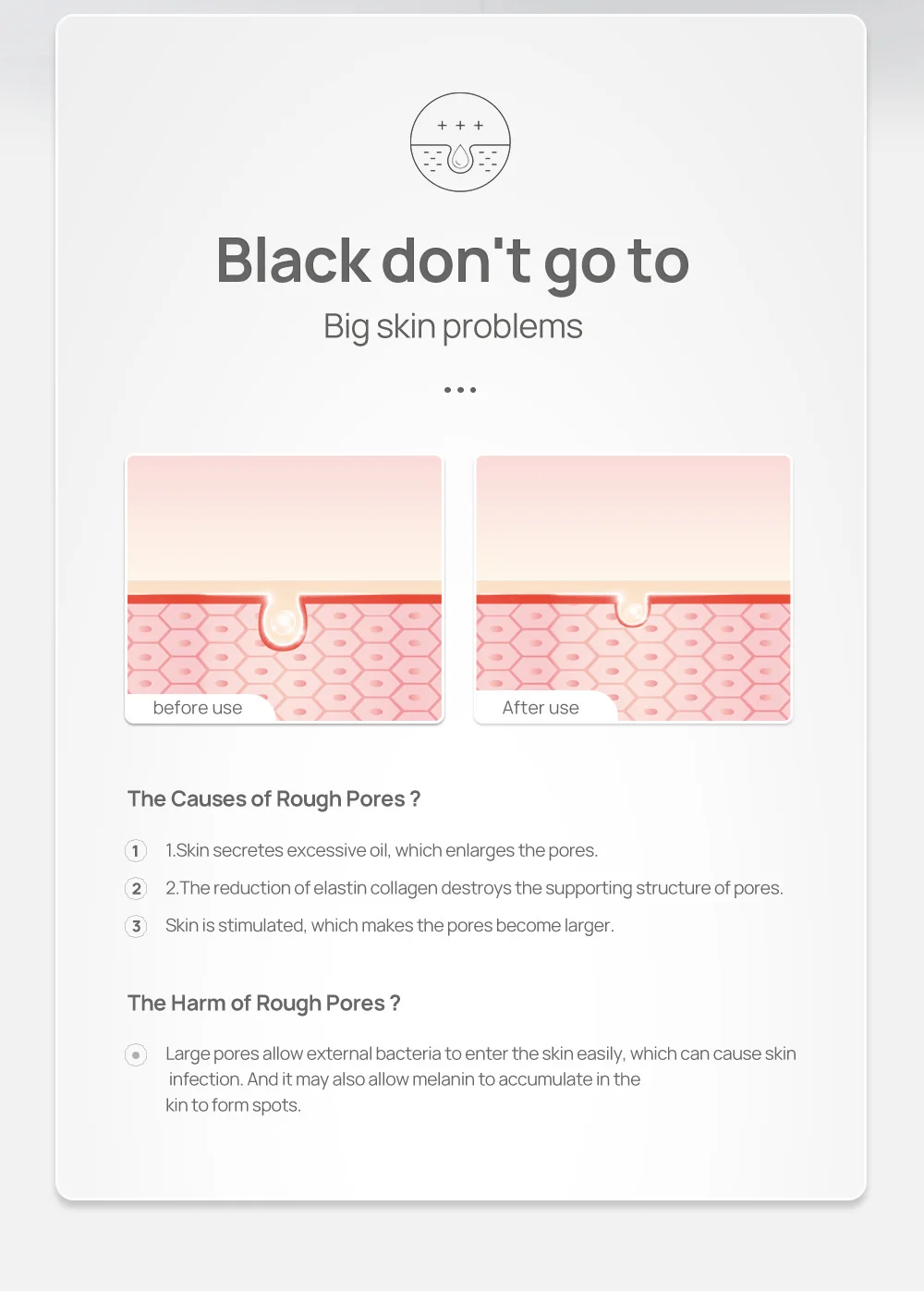 Большие проблемы с кожей▶Причины грубых пор?1. Кожа выделяет чрезмерное масло, которое увеличивает поры.2. Уменьшение эластина уменьшает поддерживающую структуру пор.3. Кожа стимулируется, что делает поры больше.▶Вред грубых пор?Большие поры позволяют внешним бактериям легко проникать в кожу, при каких обстоятельствах происходит инфекция кожи. И это также может позволить меланину накапливаться в родине, чтобы образовывать пятна.