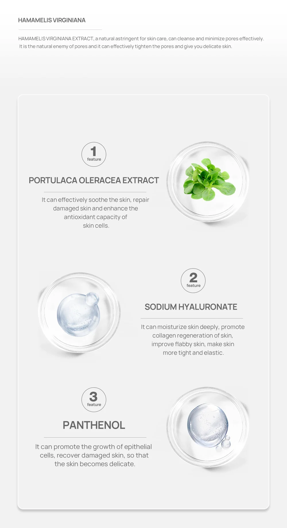 -Натуральный вяжущийLANBENA пор минимизирующая эссенция▶HAMAMELIS VIRGINIANAЭкстракт гамамелиса девственницы, натуральный вяжущий для ухода за кожей, может эффективно очищать и минимизировать поры. Это естественный враг пор, и он может эффективно затянуть поры и дать вам нежную кожу.▶1. ХарактеристикаЭкстракт олерацеи портулакаЭффективно успокаивает кожу, восстанавливает поврежденную кожу и повышает антиоксидантную способность клеток кожи.▶2. ХарактеристикаГиалуронат натрияОн может глубоко увлажнить кожу, способствовать регенерации коллагена кожи, улучшает дряблость кожи, делает кожу более плотной и эластичной.▶3. ХарактеристикаПантенолЭто может способствовать росту эпителиальных клеток, восстанавливает поврежденную кожу, так что кожа становится нежной.
