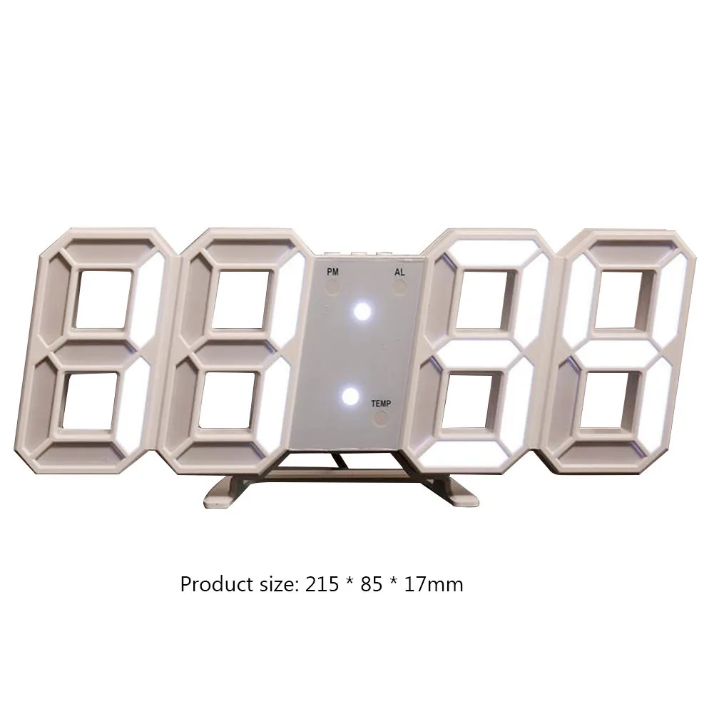 3D светодиодный цифровой настенные часы Дата Время Цельсия ночник Дисплей Настольный Будильник для дома гостиной спальни ДекорОписание:Светодиодный дисплей, отображение времени, отображение даты, отображение температуры, отображение будильника, автоматическая регулировка чувствительности, ручная регулировка яркостиСамый высокий уровень освещения-L3, а самый низкий-L0.Его можно использовать на рабочем столе или на стенеНочью его можно поместить на стол как атмосферный Ночной светильник, всегда напоминая себе, что вы должны быть полны энергии каждый день.Светодиодный экран автоматически передает время, дату и температуру.Спецификация:Размер изделия: 215*85*17 мм/8,46*3,35*0,67 дюймовОдин размер упаковки: 225*96*37 мм/8,85*3,7 * 1.45inВес нетто: 165,8 гВес одного брутто: 232,9 гДиапазон температур 0 ℃-50 ℃(32 ℉-122 ℃)Уровень: AL1, AL2, AL3Режим питания: аккумулятор памяти CR2032 (в комплекте)Источник питания: DC5V источник питанияUSB кабель: белая рамка с белыми проводами, черная оправа с черными провода, длина линии 1,5 мЦвет: белый, черныйПримечание:В связи с различиями мониторов и эффектами освещения реальный цвет товара может немного отличаться от цвета на фотографиях. Спасибо!Возможны отклонения в 1-2 см вследствие измерений вручную.