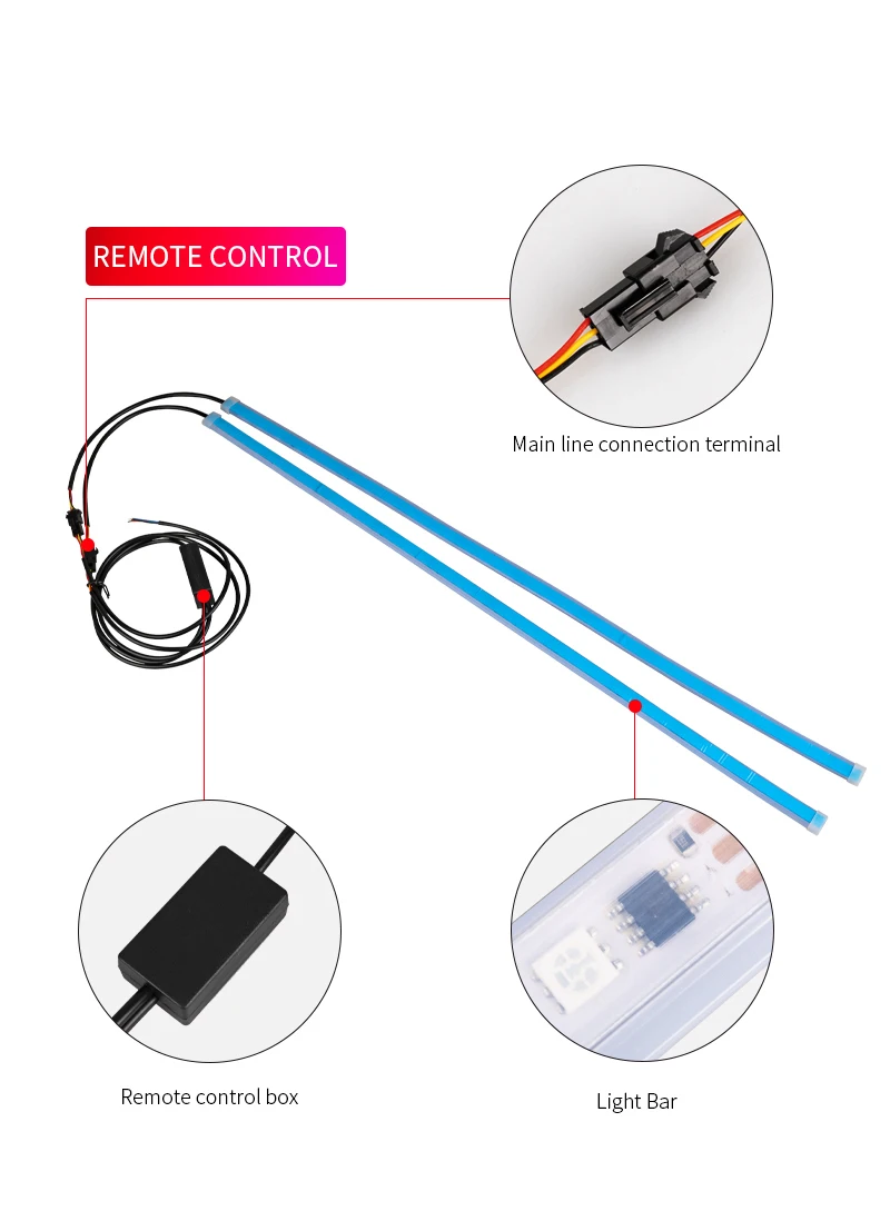 СпецификацияТип: Гибкая мягкая Светодиодная лентаМатериал: АБС + силиконТип СВЕТОДИОДА: 2835 SMDВходное напряжение: 12 ВЦветность света: RGBОсвещаемая длина: 30 см/45 см/60 смПодходит для: Универсальный Автомобильный Стайлинг ОсобенностиСветодиодные DRL гибкие мягкие светодиодные полосы света для автомобиля.Можно нарядить фары, похожие на новый стиль.Водонепроницаемый-как для внутреннего/внешнего использования автомобиля, просто установка.ПрименениеАнгельский глаз, свет поворота фар.Проводное соединениеКрасный провод подключения положительного, черный провод подключения отрицательного, желтый и зеленый провод подключения сигнала поворота.Примечание: пульт дистанционного управления не содержит батареек
