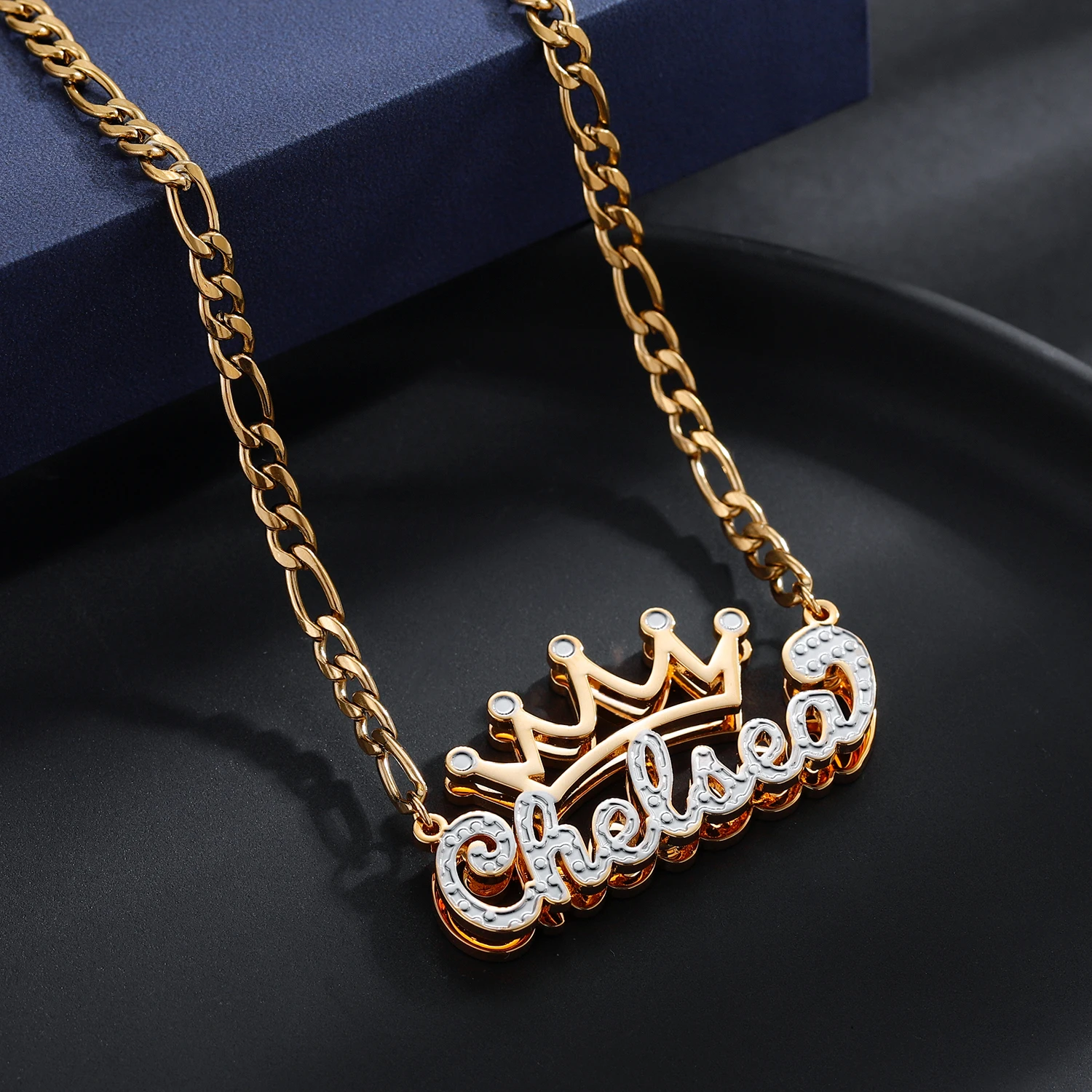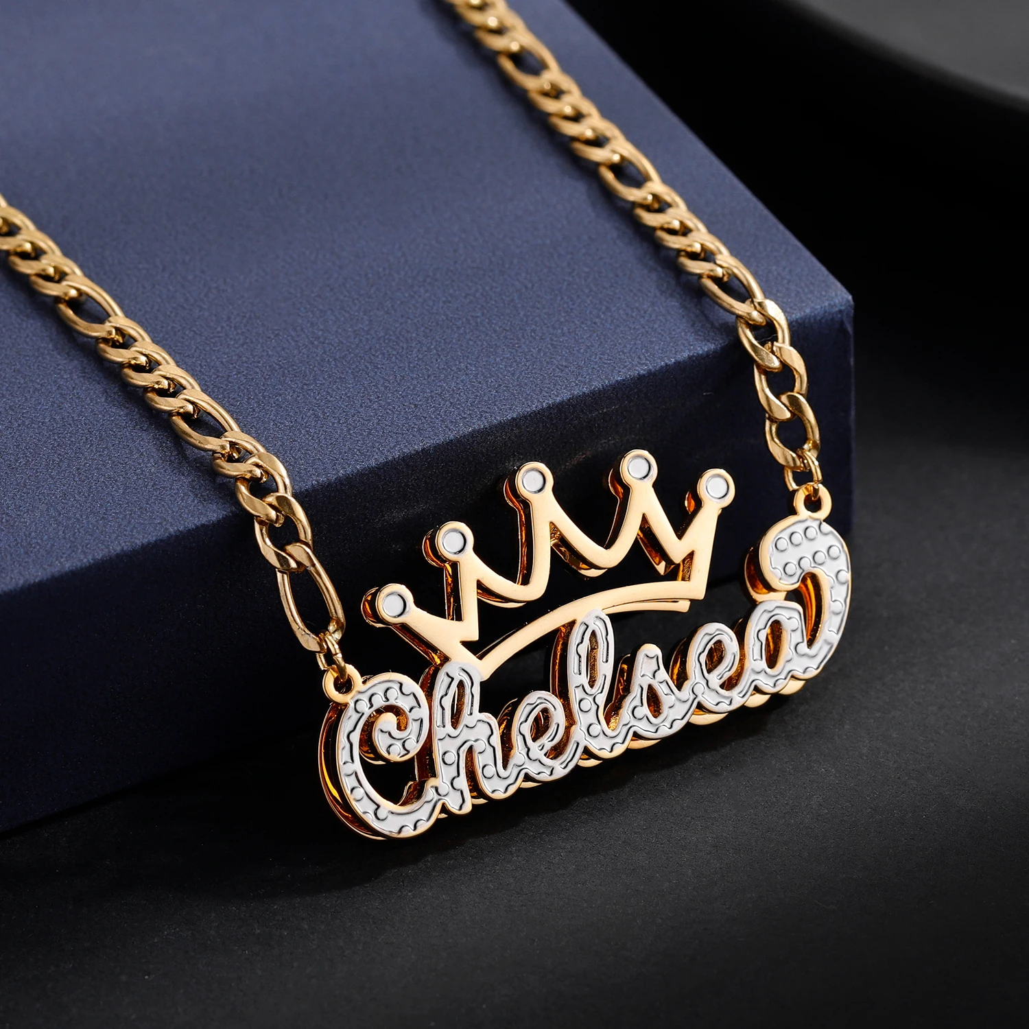 Двухцветное ожерелье с именем на заказ для нее, ожерелье с именем короны на заказ, кулон с двойной пластиной из нержавеющей стали, кубинская цепочка