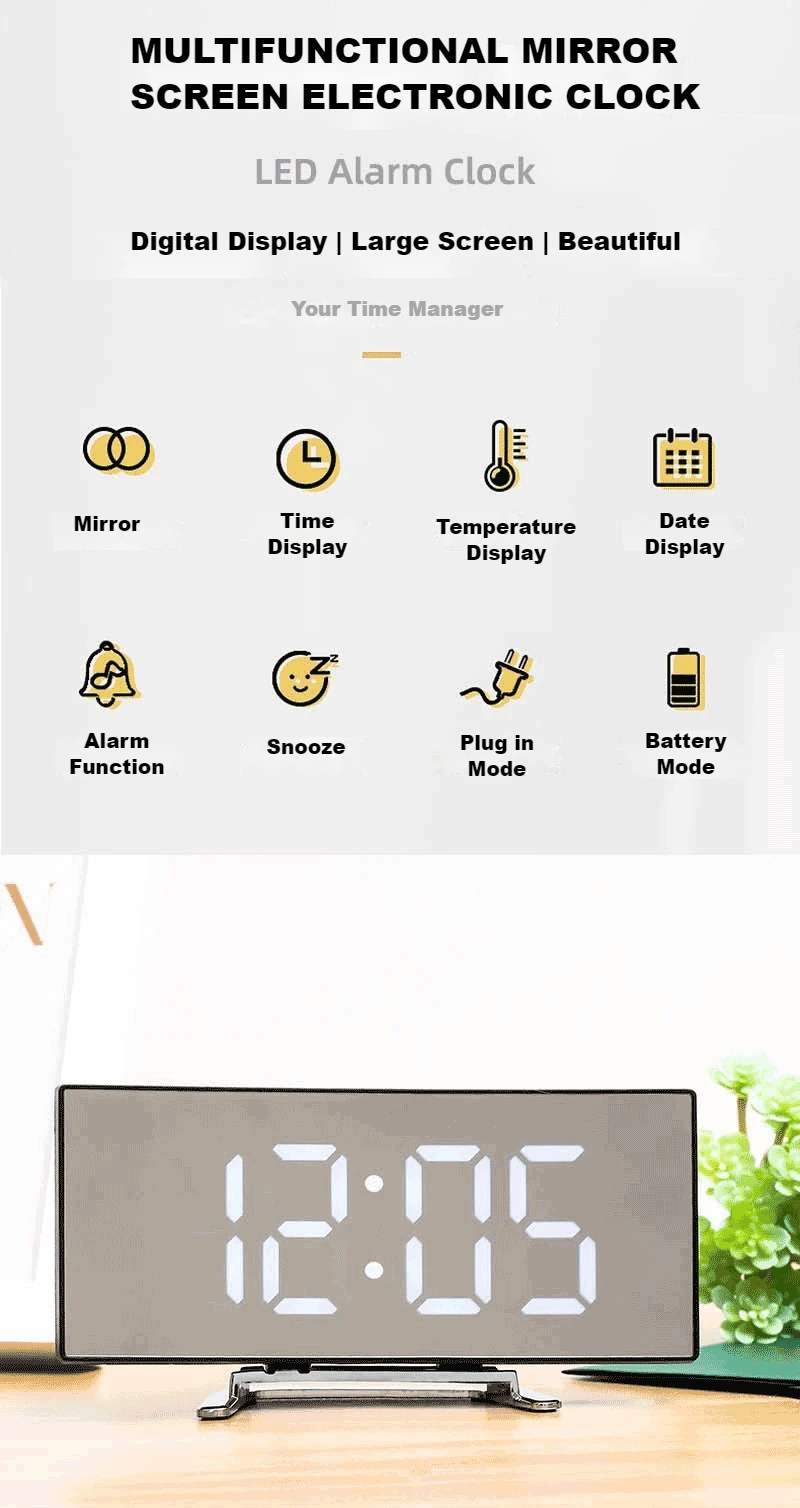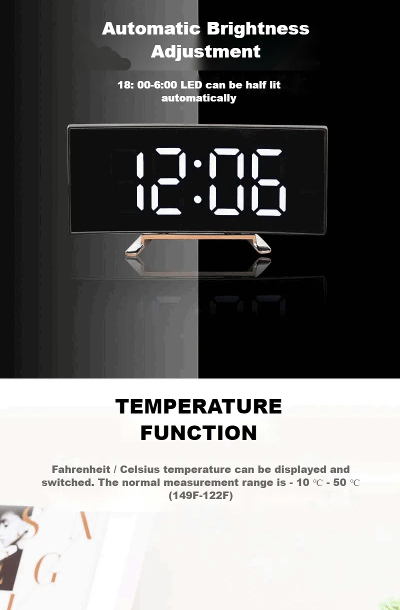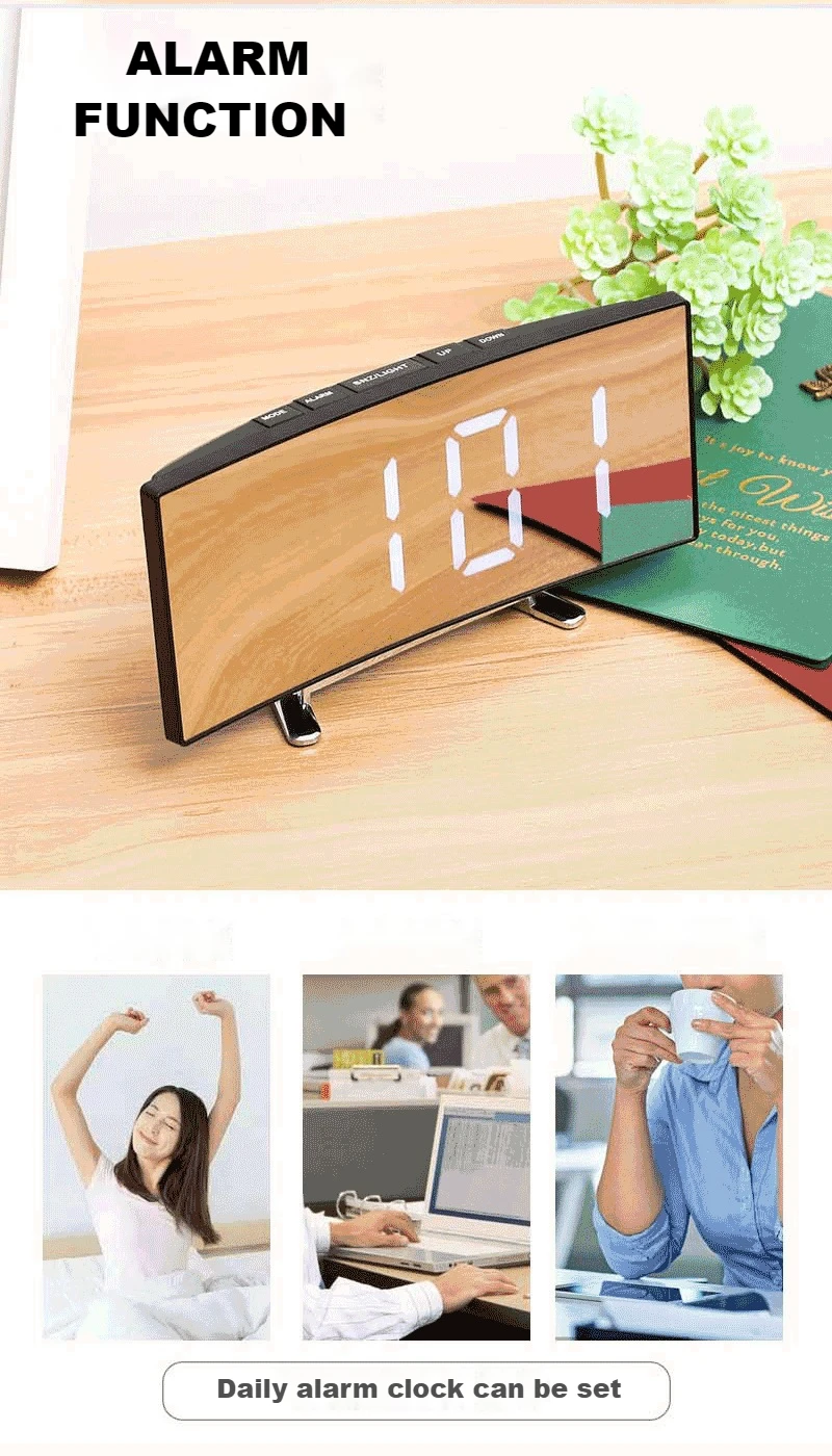 Размер: 17x8 4x3. 8 смМатериал: АБС-пластикРежим питания: 3 аккумулятора AAA/USB разъемСВЕТОДИОДНЫЙ изогнутый экран, модный и красивый, полный современной науки и техники.Функция зеркалаОтображение времениТемпературный дисплейОтображение датыФункция сигнализацииФункция повтораПодключите режим/режим батареиАвтоматически Отрегулируйте яркость и переключитесь между температурой Цельсия и температурой Фаренгейта по желанию. Ваш менеджер времени.