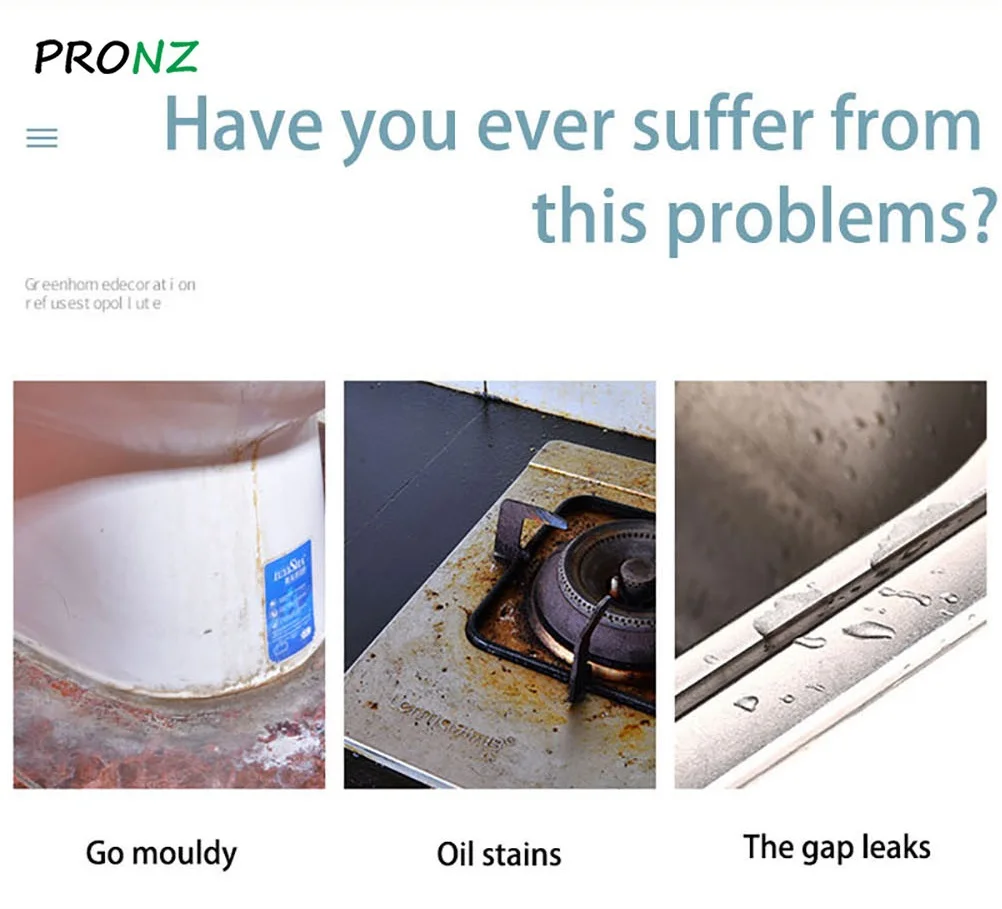 1. Обычно раковина фиксируется на столе силиконом, после длительного использования, пятна воды проникнут в силикон, поэтому силикон будет заплесневаться и потемнеть. Эта водонепроницаемая, устойчивая к плесени лента должна быть наклеена на шов между газовой плитой и столом, раковиной и столом, она может держать ваше место отлично, и легко чистить